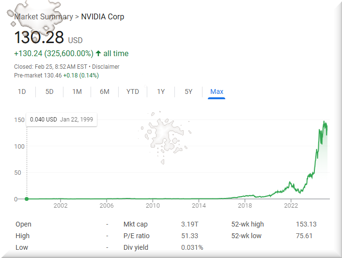 Elder G: Investing $100 in NVIDIA (NVDA) stock in January 2000, when the closing price was approximately $0.07 per share, would have purchased about 1,428 shares. As of February 25, 2025, with the stock trading at $130.28 per share, this investment would now be worth approximately $186,000.