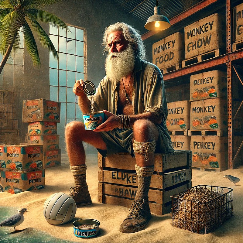 Elder G provides an image of a stranded WLBOTT Elder, contemplating the irony of life with a tin of sardines and a sardonic expression.