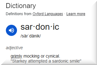 I think of “sardonic” as half-way between sarcastic and demonic. Also, you may think there is a connection between “sardonic” and “sardines”.