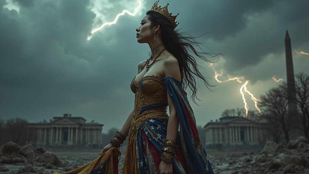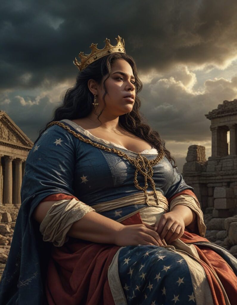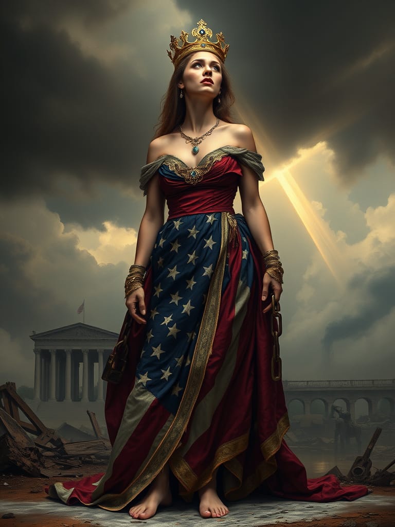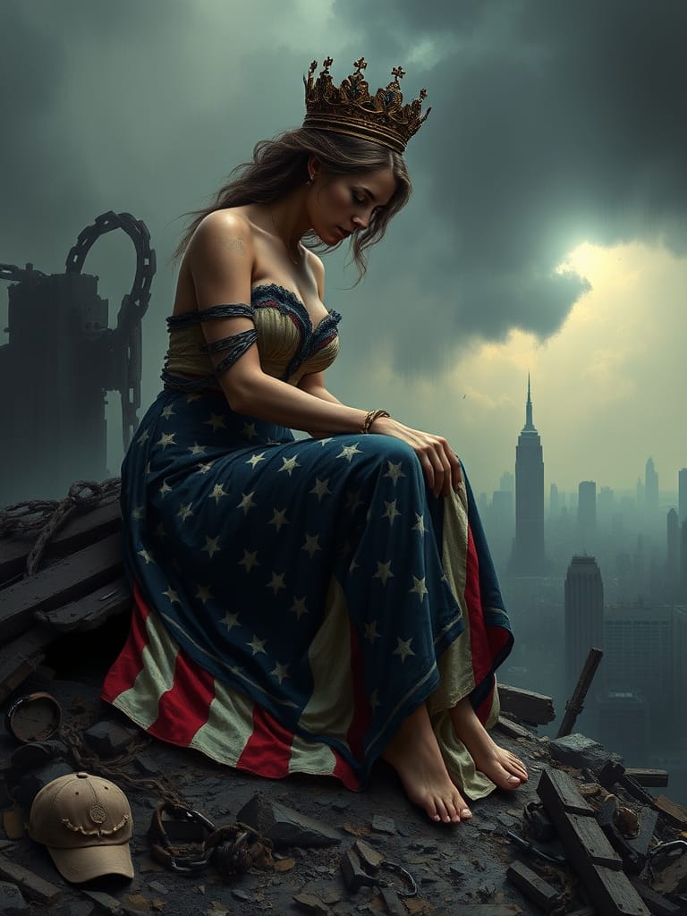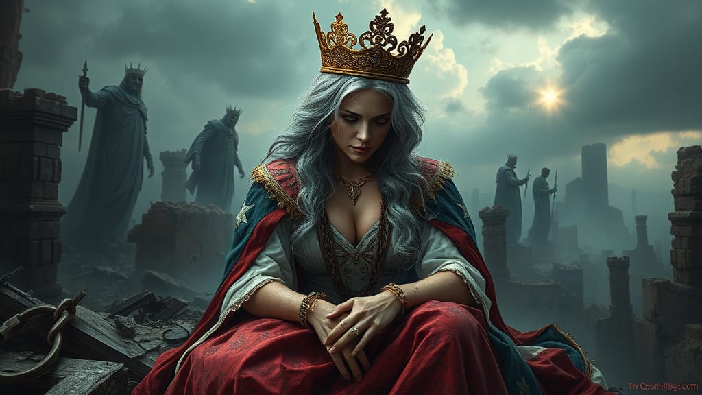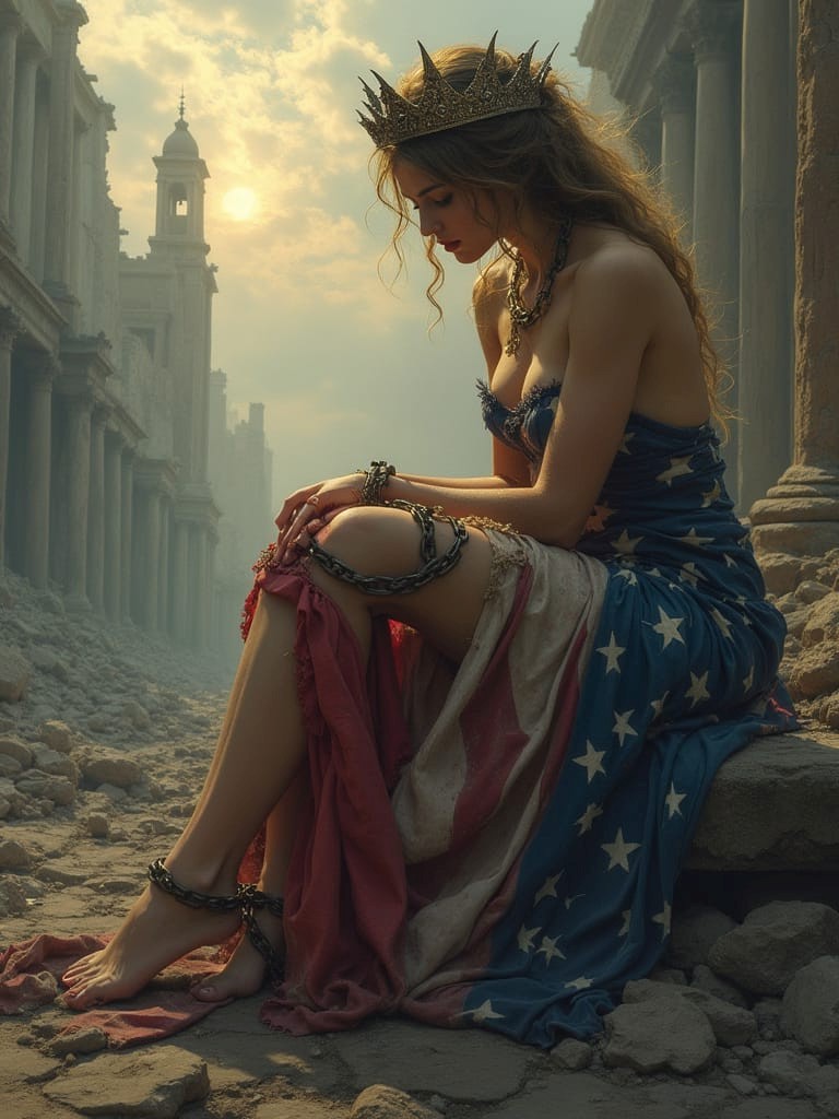 A symbolic and dramatic digital painting depicting America personified as a mature widowed queen, inspired by the imagery of Lamentations. She wears a tattered yet regal gown in faded red, white, and blue, and a tarnished crown that slips from her head. Seated on the ruins of a crumbling city, she gazes downward, sorrowful and weary, with shackles on her wrists symbolizing servitude to foreign powers. In the background, towering figures representing external influences loom over her, while distant storm clouds part slightly, hinting at a glimmer of hope. The image should convey loss, resilience, and the weight of history.