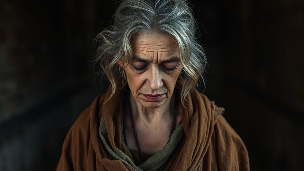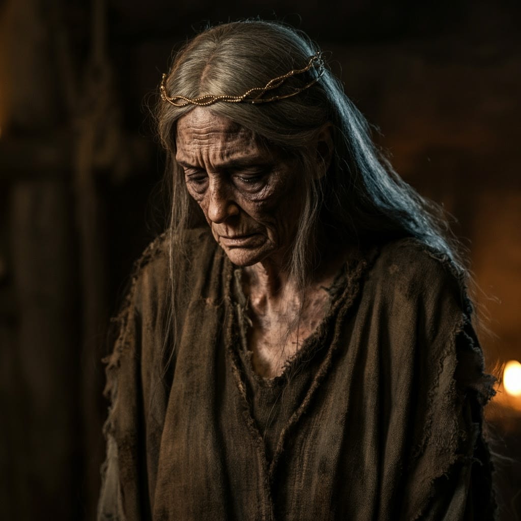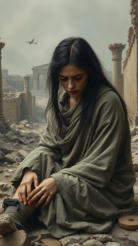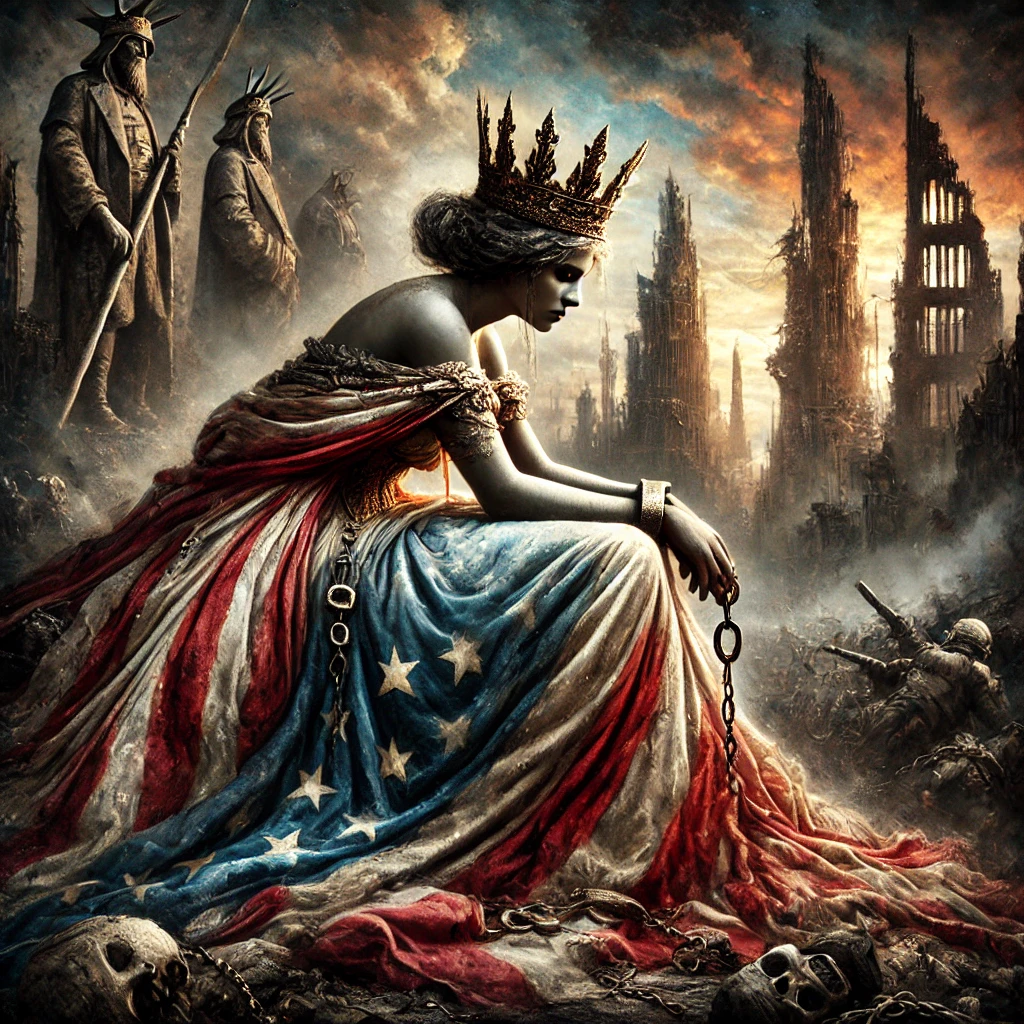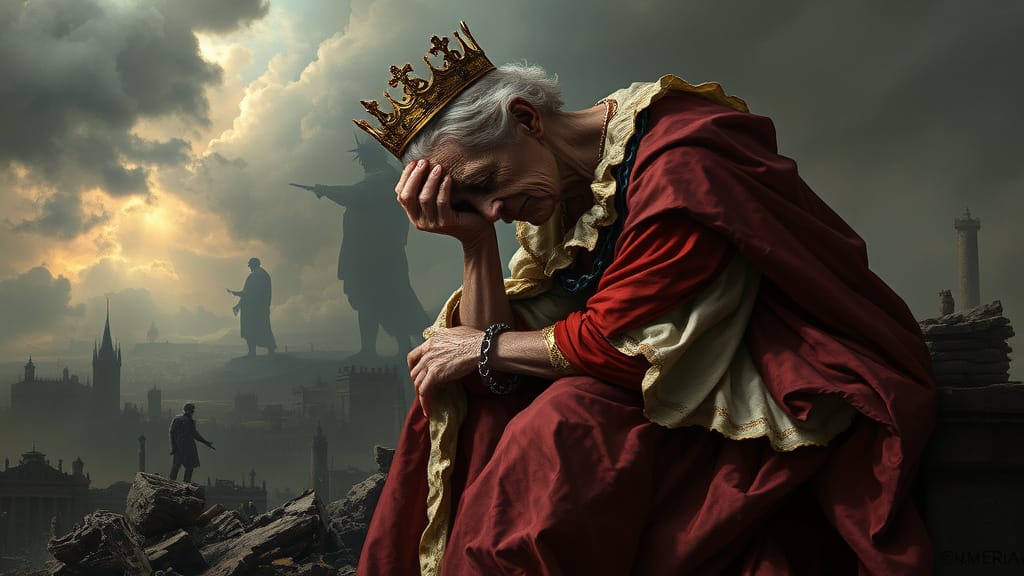 A symbolic and dramatic digital painting depicting America personified as a mature widowed queen, inspired by the imagery of Lamentations. She wears a tattered yet regal gown in faded red, white, and blue, and a tarnished crown that slips from her head. Seated on the ruins of a crumbling city, she gazes downward, sorrowful and weary, with shackles on her wrists symbolizing servitude to foreign powers. In the background, towering figures representing external influences loom over her, while distant storm clouds part slightly, hinting at a glimmer of hope. The image should convey loss, resilience, and the weight of history.