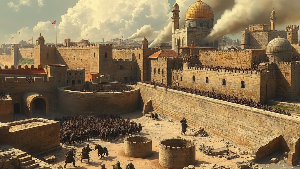 The siege of Jerusalem (c. 589–587 BCE) was the final event of the Judahite revolts against Babylon, in which Nebuchadnezzar II, king of the Neo-Babylonian Empire, besieged Jerusalem, the capital city of the Kingdom of Judah. Jerusalem fell after a 30-month siege, following which the Babylonians systematically destroyed the city and Solomon’s Temple. The Kingdom of Judah was dissolved and many of its inhabitants exiled to Babylon.