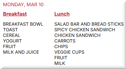 Tomorrow’s lunch features a choice between a spicy chicken sandwich or a chicken sandwich.