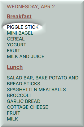 note: a Piggle Stick is the breakfast version of a Corn Dog.