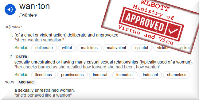 First, we had to educate ourselves, and were surprised to discover that “wanton” was such a spice word. We had to get permission from the WLBOTT Ministry of Virtue and Vice to proceed with this BLOTT.