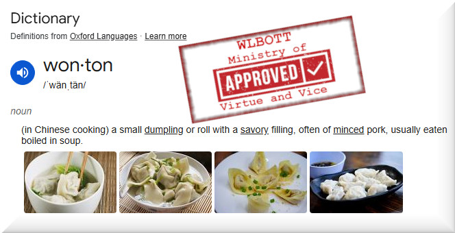 We repeated the process for “wonton.” Since the word “dumpling” can be problematic, we again sought approval from the WLBOTT Ministry of Virtue and Vice.