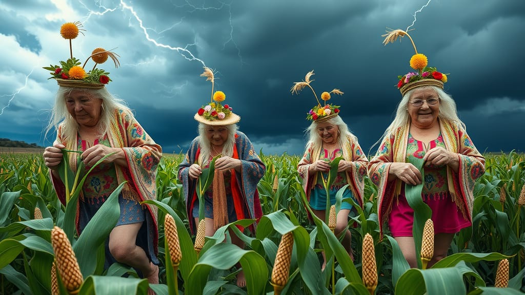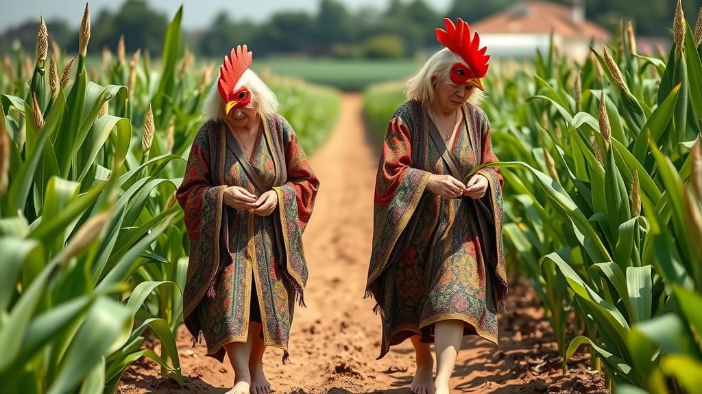 Lately, Virgil’s detasseling trips have grown… longer. He’s been gone from sun-up to moonset. He insists it’s all part of the hybrid process. Yet I recently found a postcard in his pocket—from a Corn Queen Festival in Kansas, with a suspicious lipstick smudge.