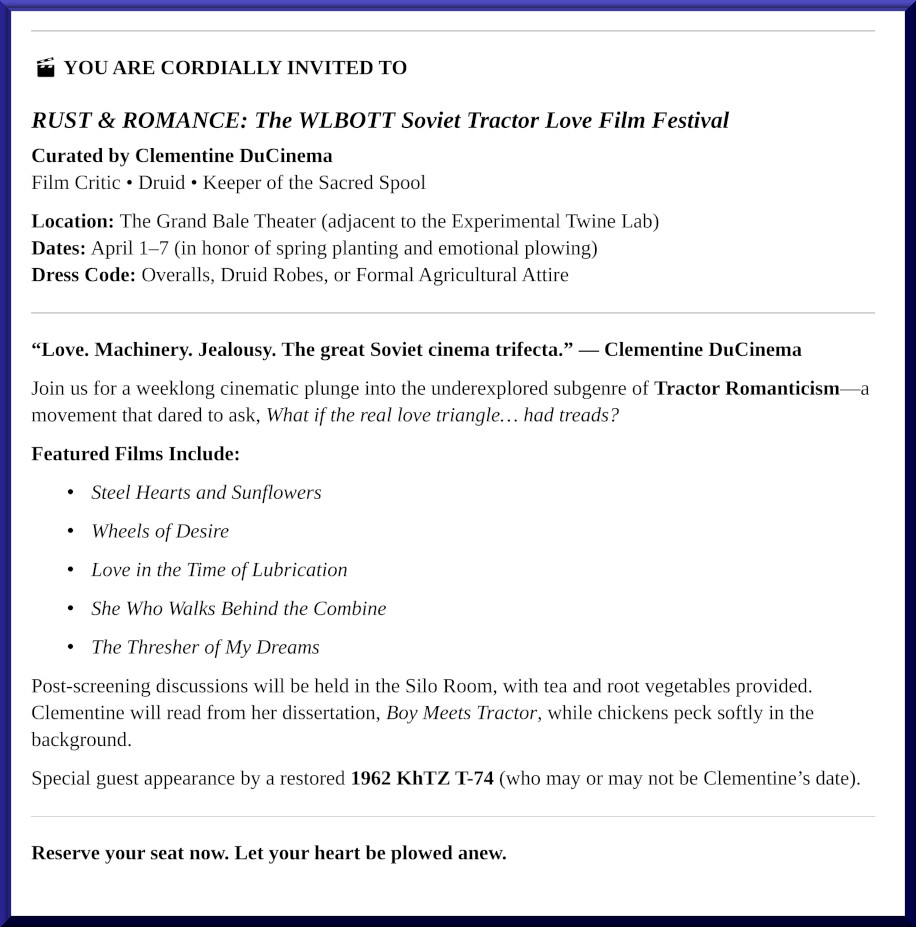 She has announced the first WLBOTT Annual Film Festival. This year’s theme: Boy Meets Tractor – A Celebration of Soviet Cinema.