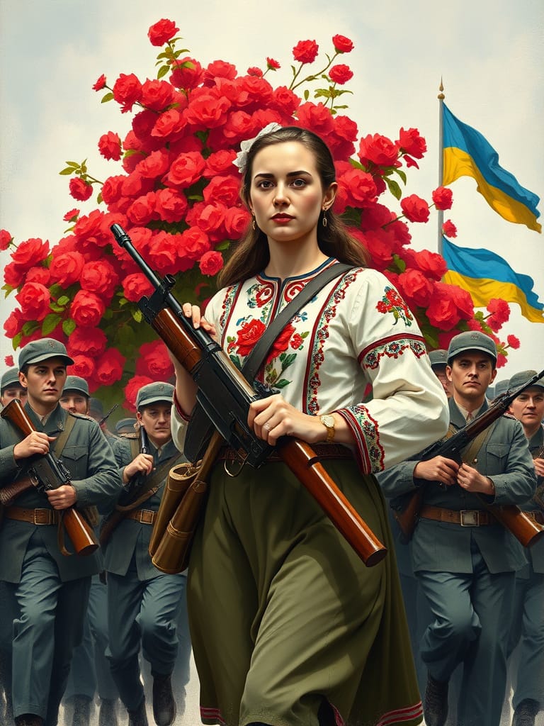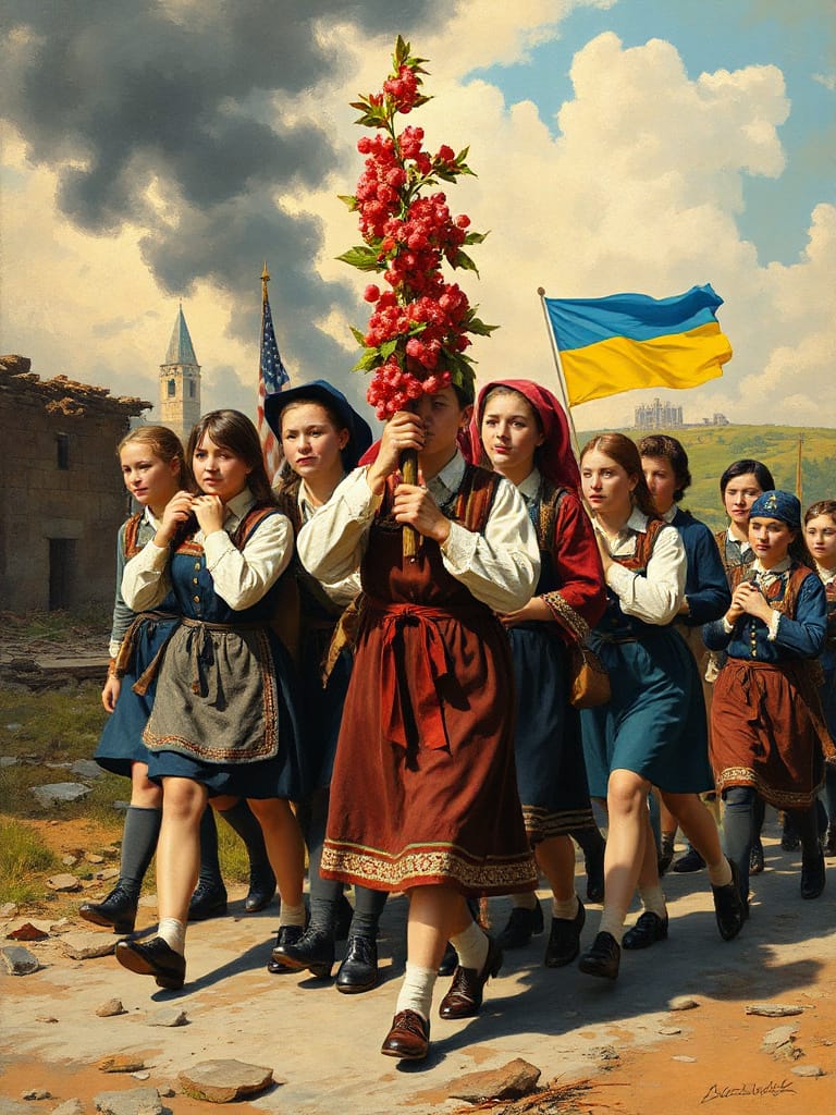And we will cheer our glorious Ukraine up, hey-hey! But we will raise that red viburnum!