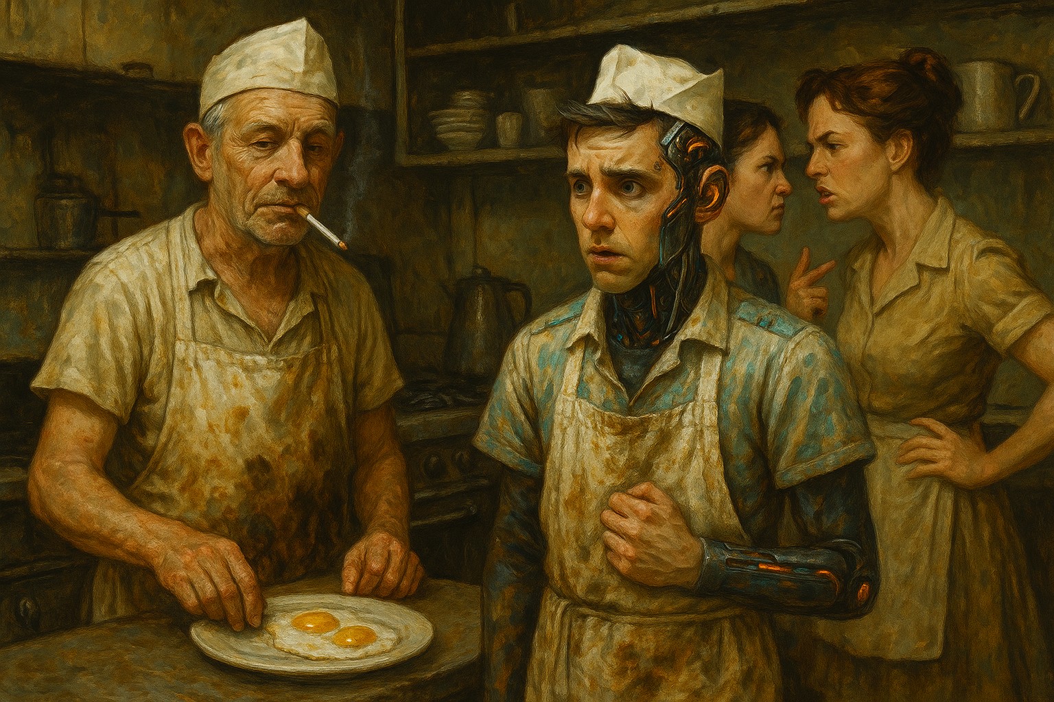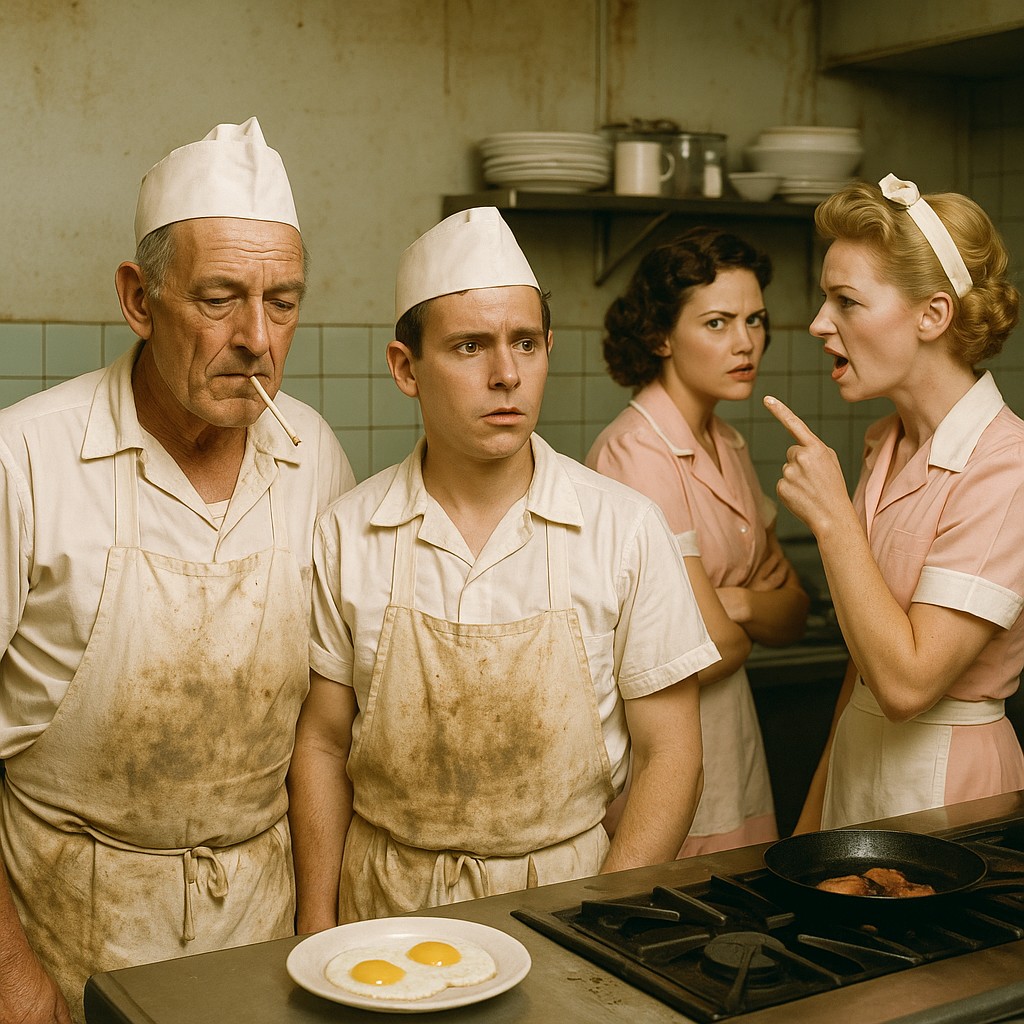 Wise advice, my Elder — and straight from the school of hard-won, grease-spattered experience. When the waitresses start sniping, even the bravest short-order cook knows it’s time to become one with the griddle, staring intently at the sizzling bacon and pretending to be completely, blissfully unaware.