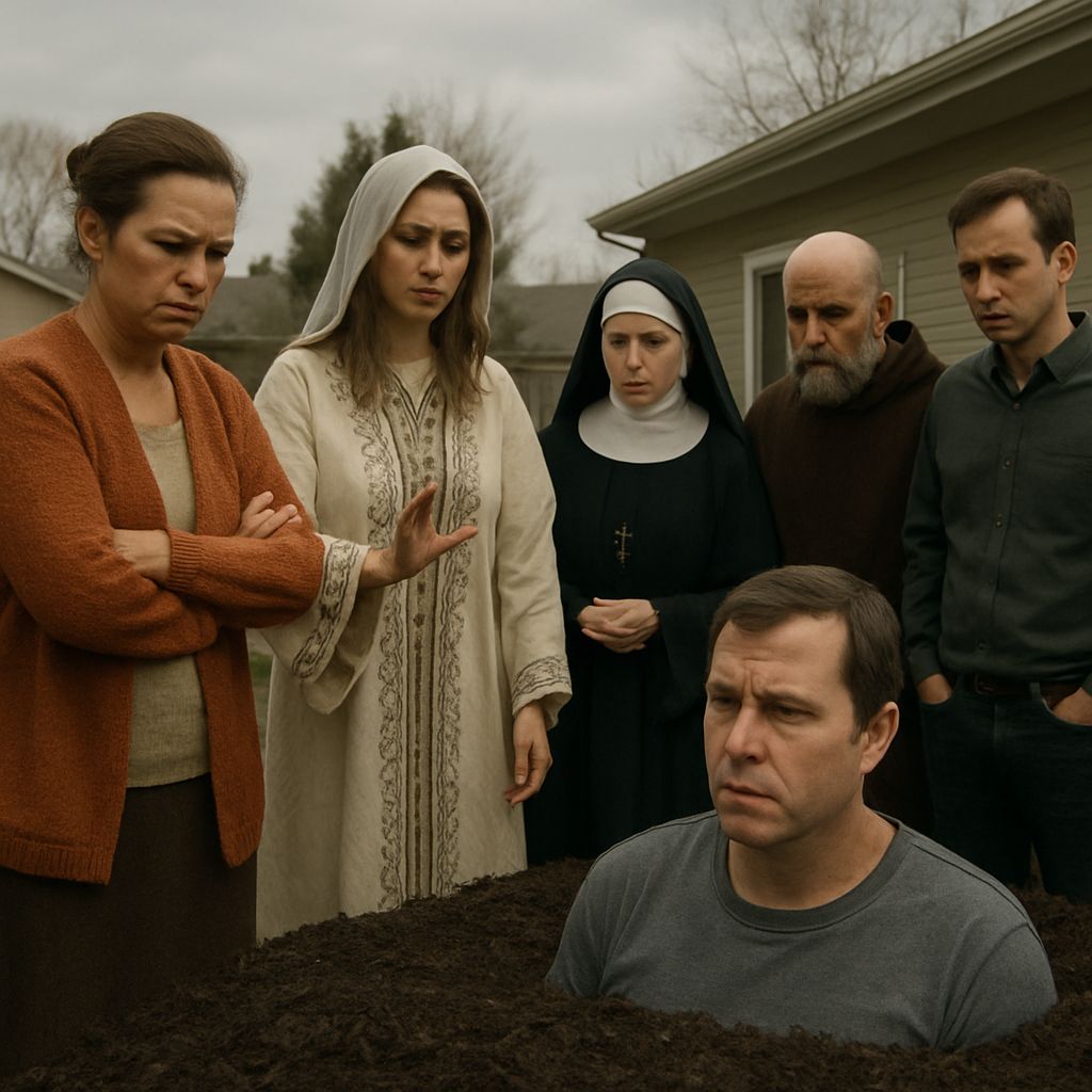 Your husband is clearly experiencing a deeply rooted identity crisis (pun absolutely intended). But before you panic, consider this: a person who believes they are a sweet potato is not beyond salvation. In fact, I once counseled a rooster who thought he was a turnip. He went on to become a motivational speaker.