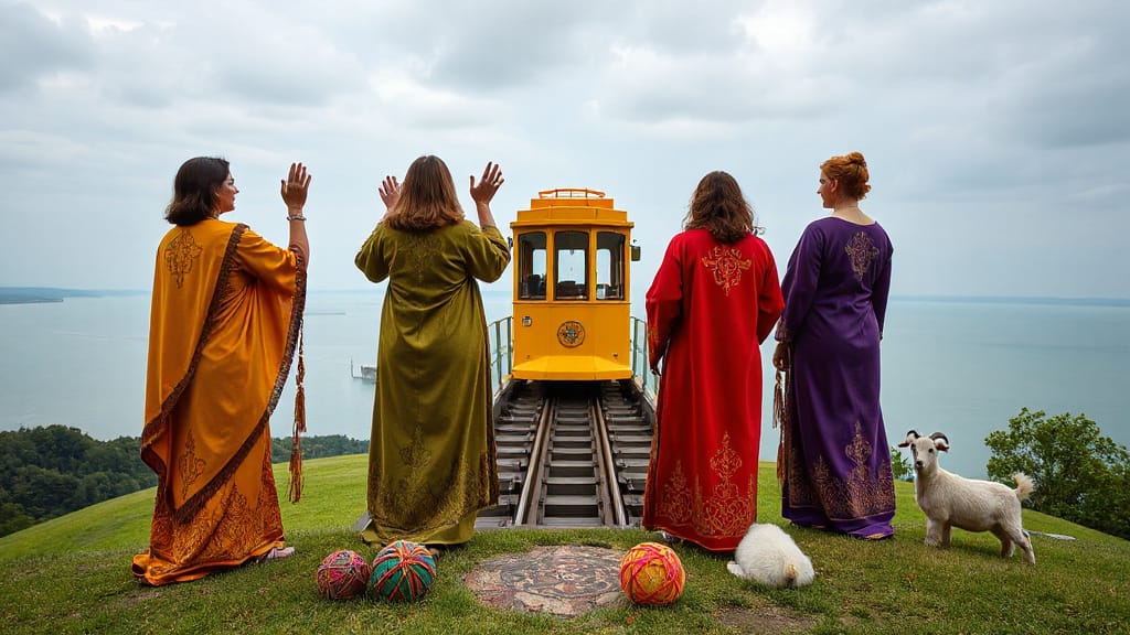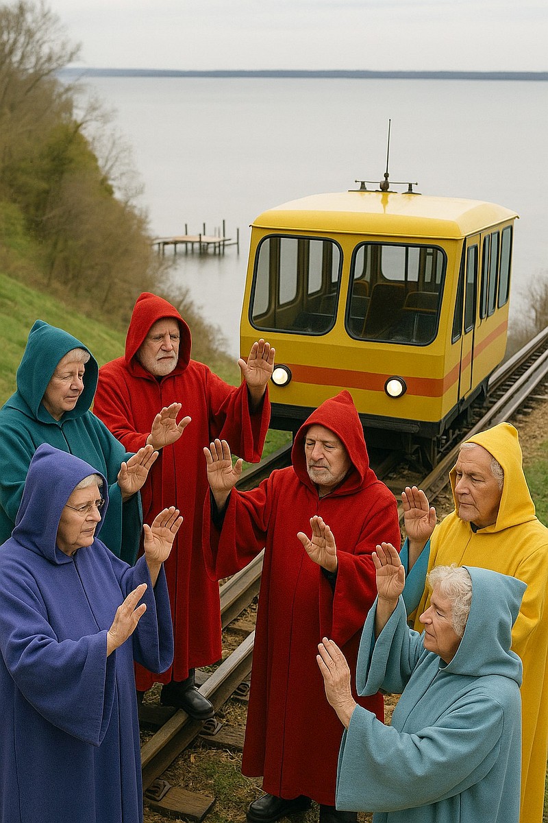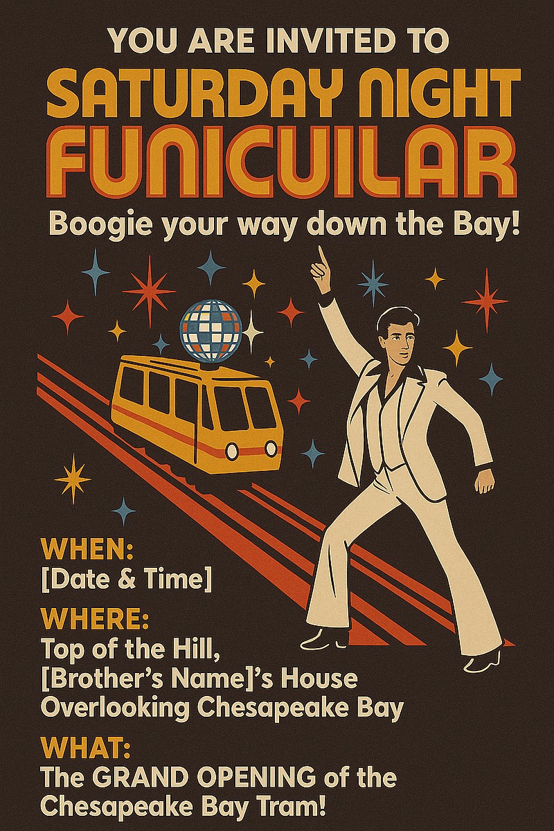 WLBOTT: Okay, here’s the backstory. A fellow WLBOTT Elder lives at the top of a hill overlooking Chesapeake Bay. He is building a tram, or funicular, that will go from his house, down to the dock below. He’s wondering how to celebrate the completion of the construction, and I was thinking “Saturday Night Funicular”.