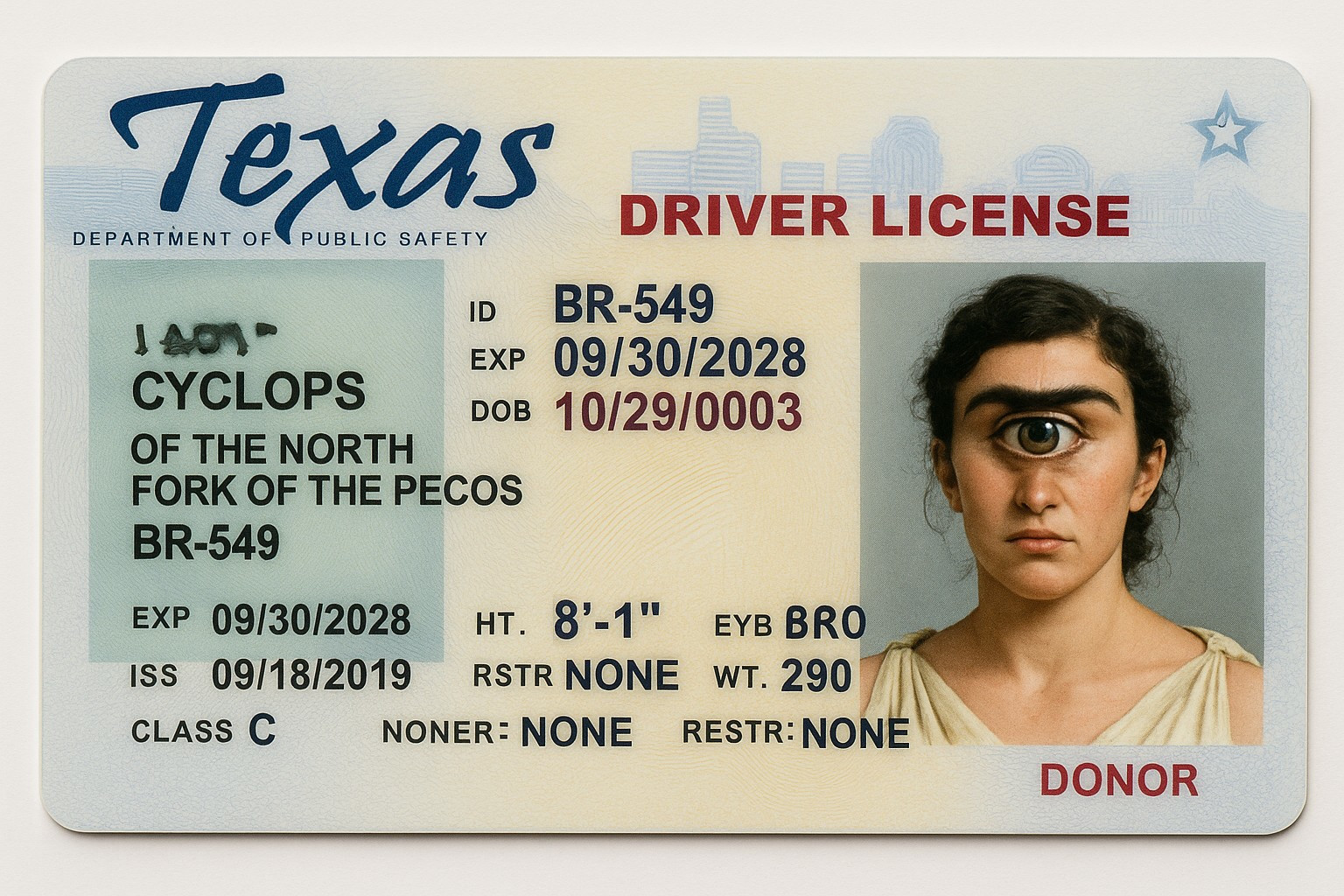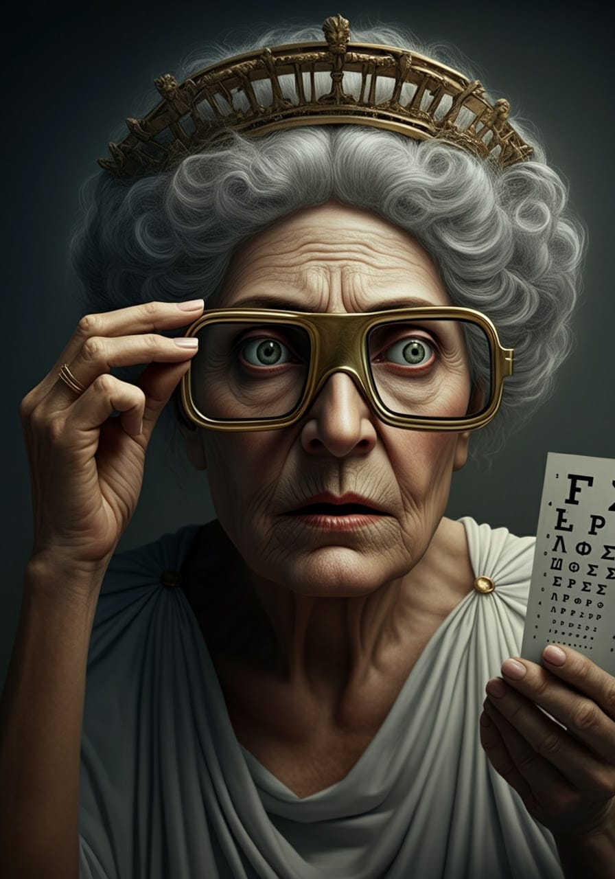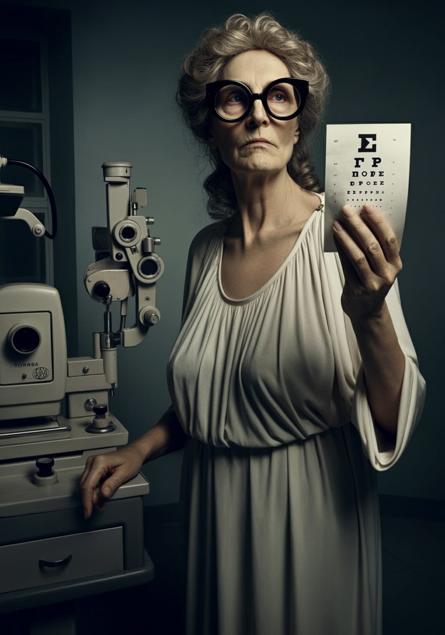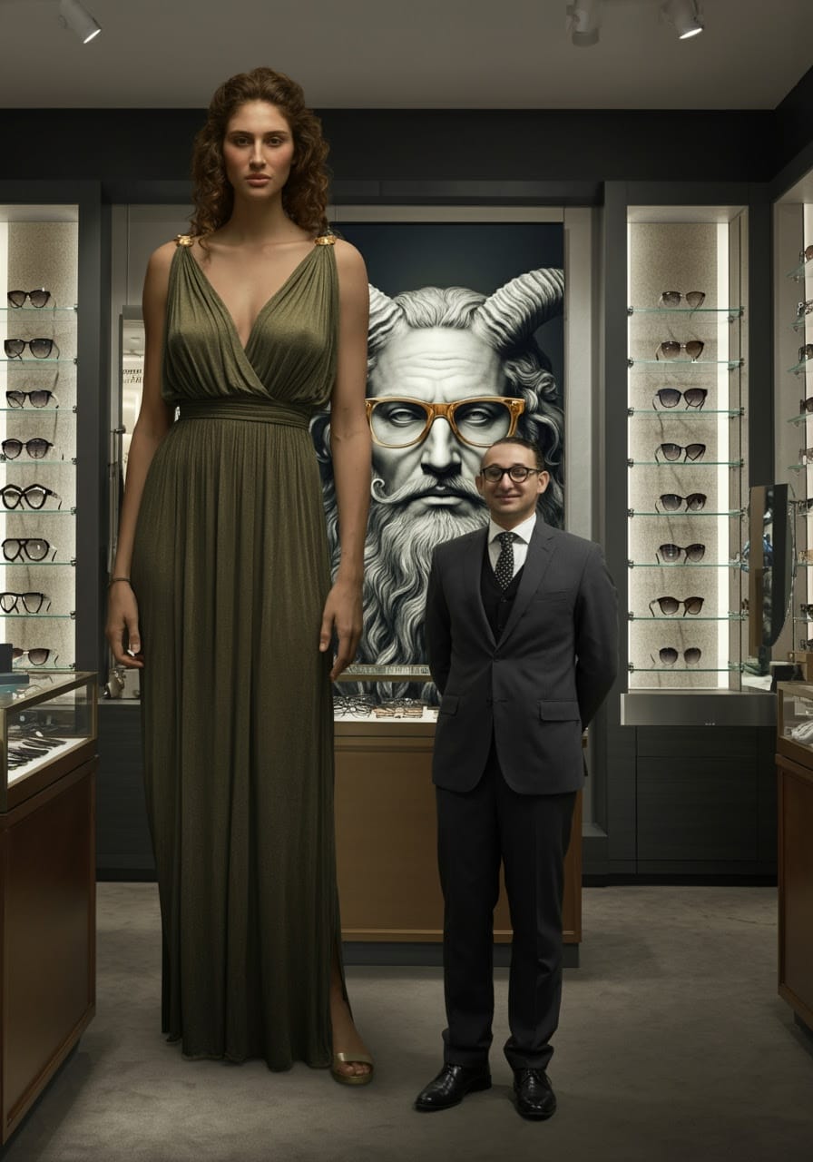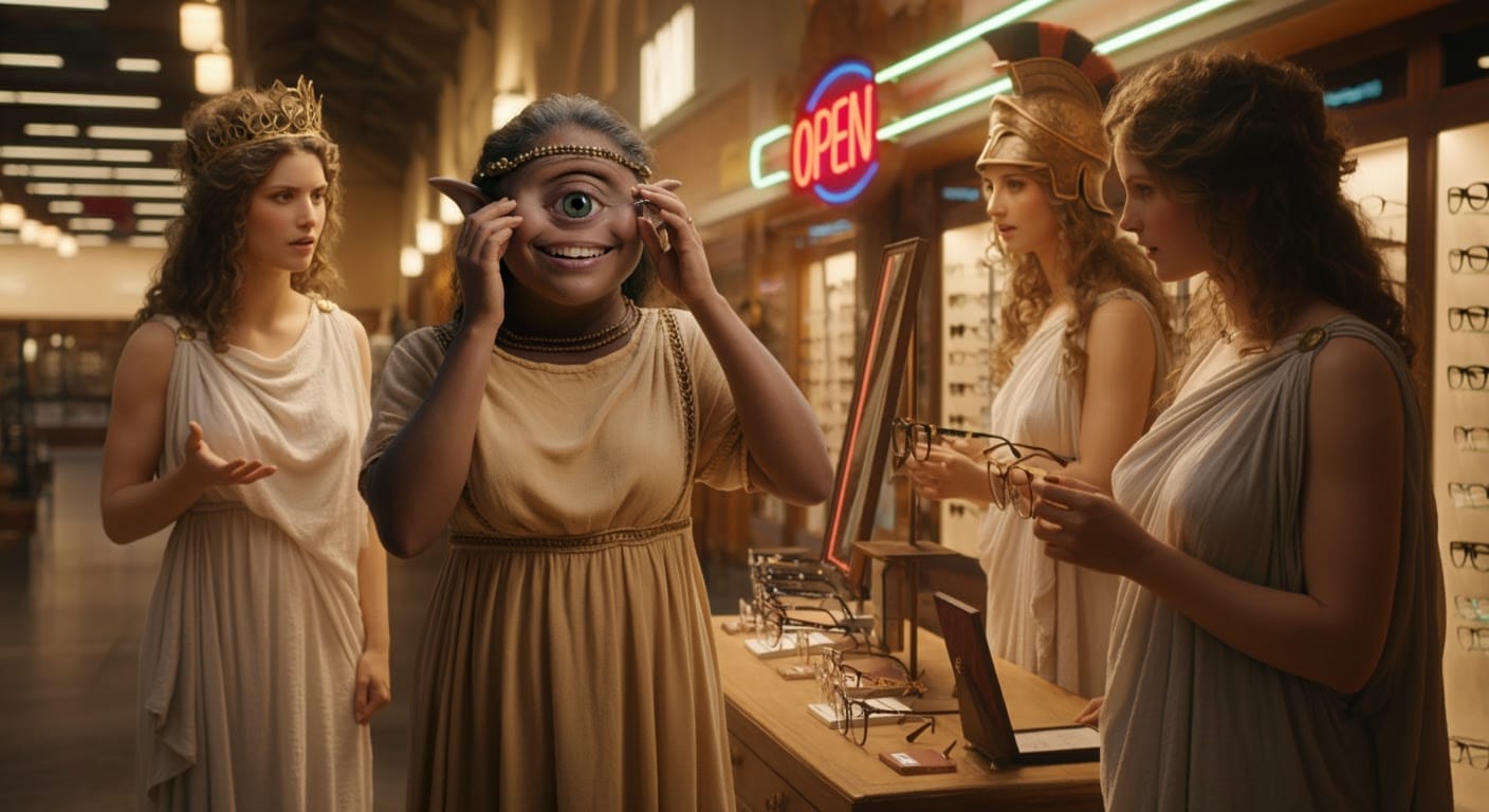 Ophthalmaia‘s cousin, Theresa Tryclops, was also able to find a fashionable some Trivision eyewear – “Thrice As Nice™” – fashion-forward frames for mythic cousins.