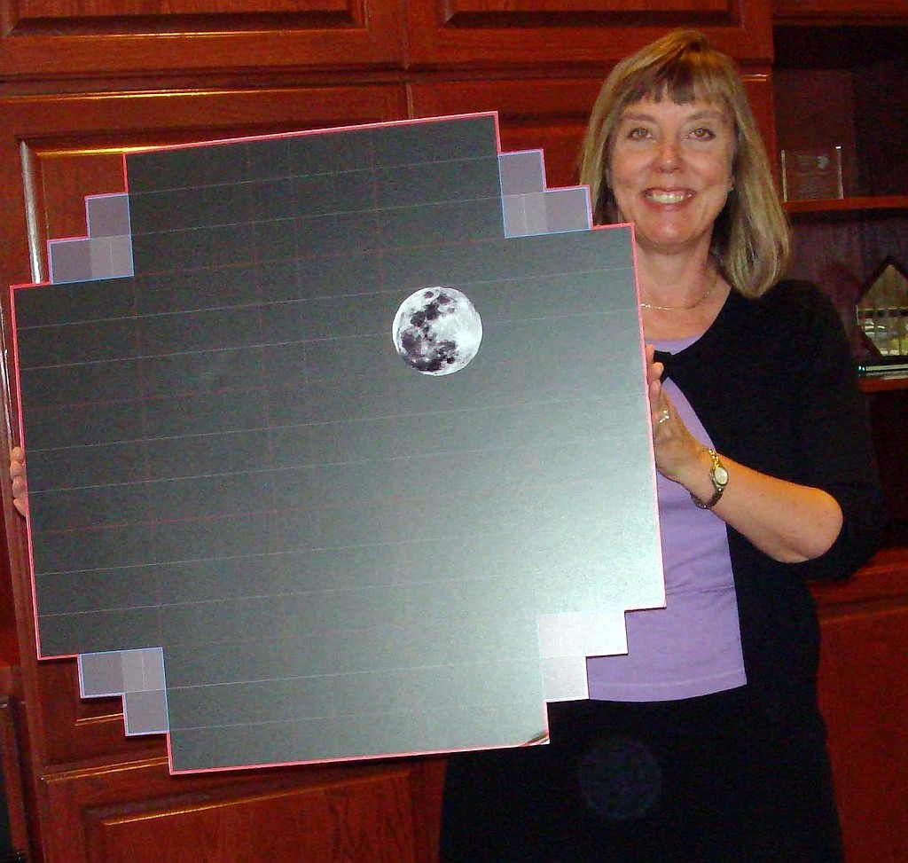 Life-size model of the LSST focal plane array. The array’s diameter is 64 cm, and will provide 3.2 gigapixels per image. The image of the Moon (30 arcminutes) is present to show the scale of the field of view. The model is held by Suzanne Jacoby, the Rubin Observatory communications director. By LSST Project/NSF/AURAWikipedia