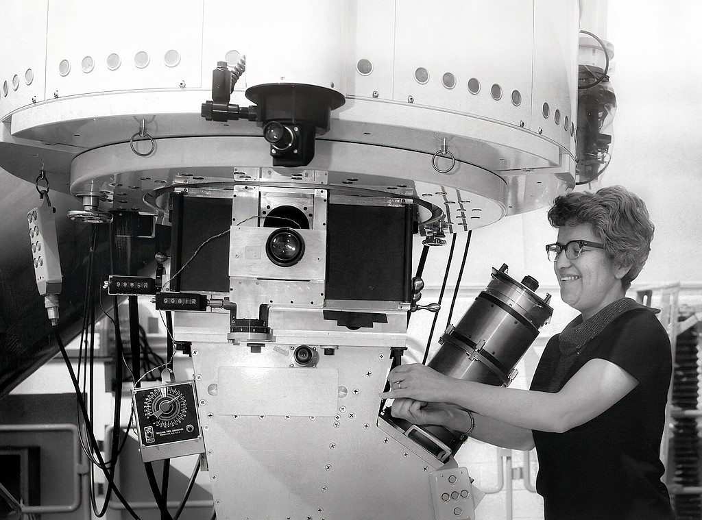 Rubin in 1963 using Kitt Peak National Observatory’s 36-inch telescope with Kent Ford’s image tube spectrograph attached By KPNO/NOIRLab/NSF/AURA – Vera Rubin at Work, NOIRLab, CC BY 4.0