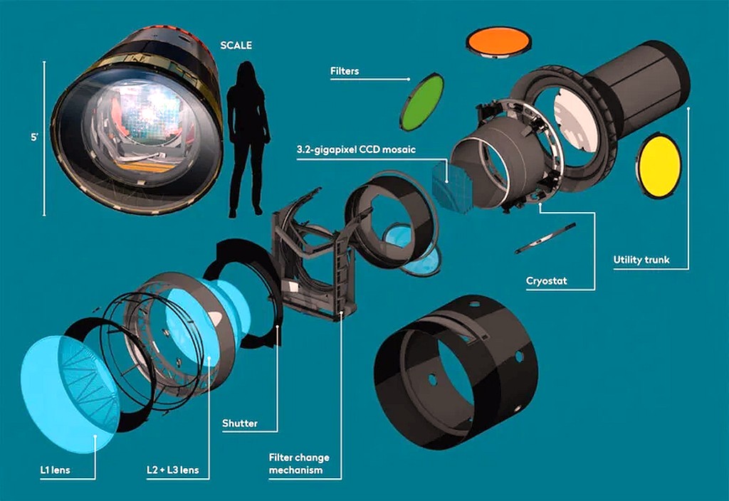 Vera C. Rubin Observatory and the Milky Way By Rubin Observatory/NSF/AURA/B. Quint – https://noirlab.edu/public/images/iotw2207a/The LSST primary/tertiary mirror successfully cast, August 2008 By Howard Lester / LSST – https://www.lsst.org/sites/default/files/photogallery/Group_photo-full.jpgColor-coded cutaway drawing of the LSST camera By Todd Mason, Mason Productions Inc. / LSST CorporationThe LSST camera sensor By Cmglee – Own work, CC BY-SA 4.0
