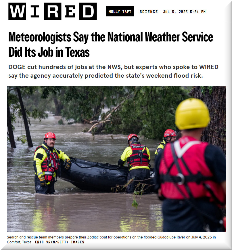 There is a story going around that the National Weather Service failed to raise the alarm about this terrible flood in Texas. That story serves the function of blaming the Trump Administration for sabotaging the NWS and NOAA, which indeed it has, and that is a very bad thing. But the NWS didn’t fail, so far as I can tell and this story says. Local and state authorities failed to do their job, which is to take the warnings the rest of the way to the people.