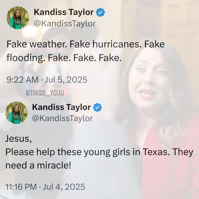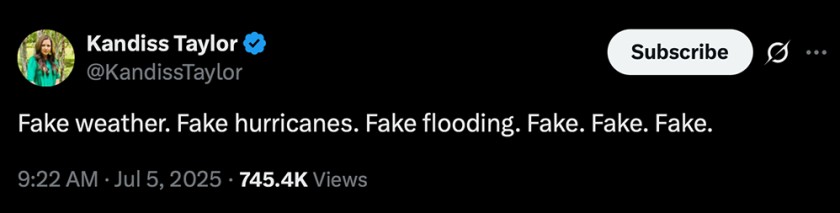 ‘Fake weather. Fake hurricanes. Fake flooding. Fake. Fake. Fake,’ Taylor wrote on X on Saturday, the day after the floods deluged central Texas.