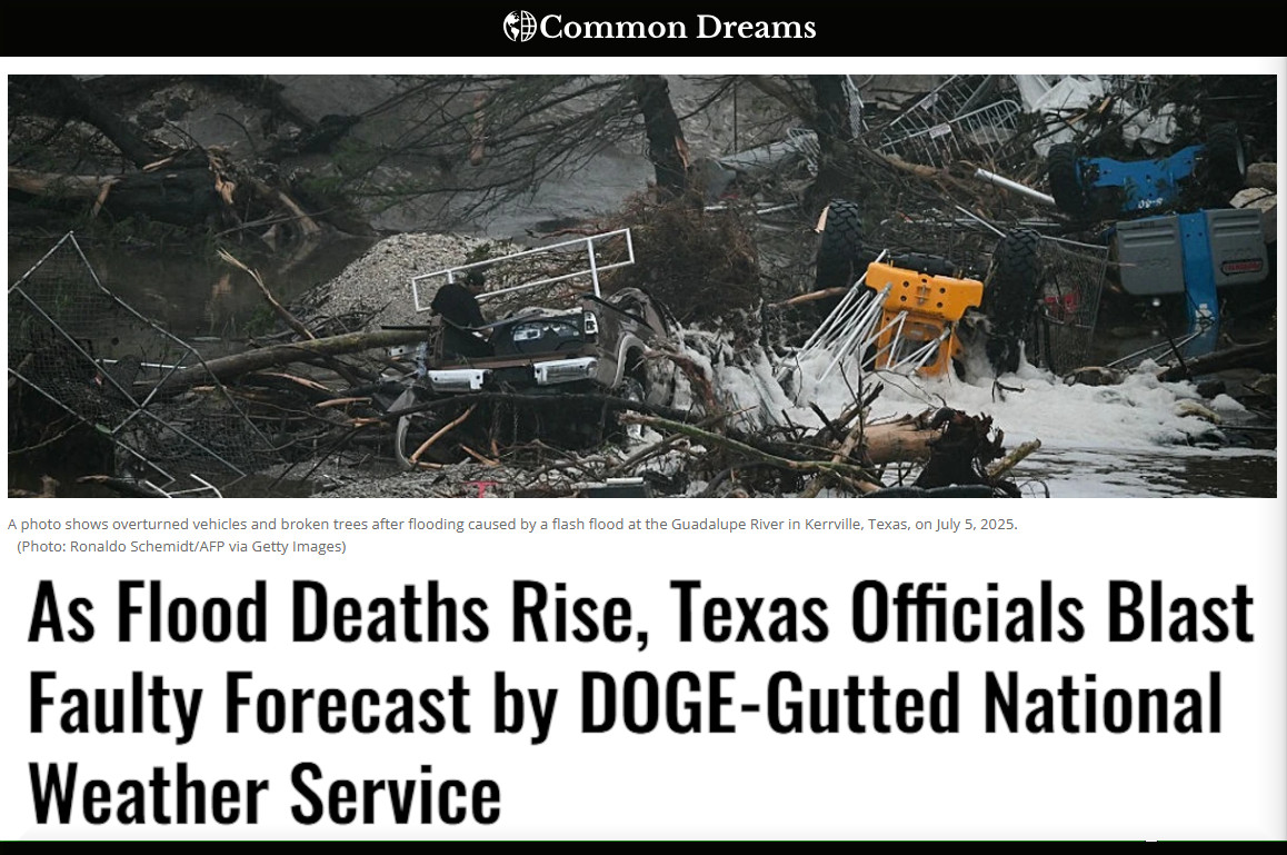 As catastrophic flooding left scores of people dead and missing in Texas Hill Country and President Donald Trump celebrated signing legislation that will eviscerate every aspect of federal efforts to address the climate emergency, officials in the Lone Star State blasted the National Weather Service—one of many agencies gutted by the Department of Government Efficiency—for issuing what they said were faulty forecasts that some observers blamed for the flood’s high death toll.