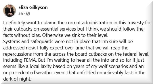 Because ultimately, it was an act of man that led to the inaction of the weather service. People on the ground were not sufficiently warned of the impending disaster due to the work of Elon Musk and DOGE. Musk gutted the National Weather Service, NOAA, and FEMA. Why, because climate change is a hoax. Just look at the ridiculous bill Trump just signed. Drill baby drill, oil, coal, gas, fracking, you name it. Trump has pulled all funding for Green energy projects, including solar, wind, and Electric Vehicles, one of Musk’s own complaints about the bill.