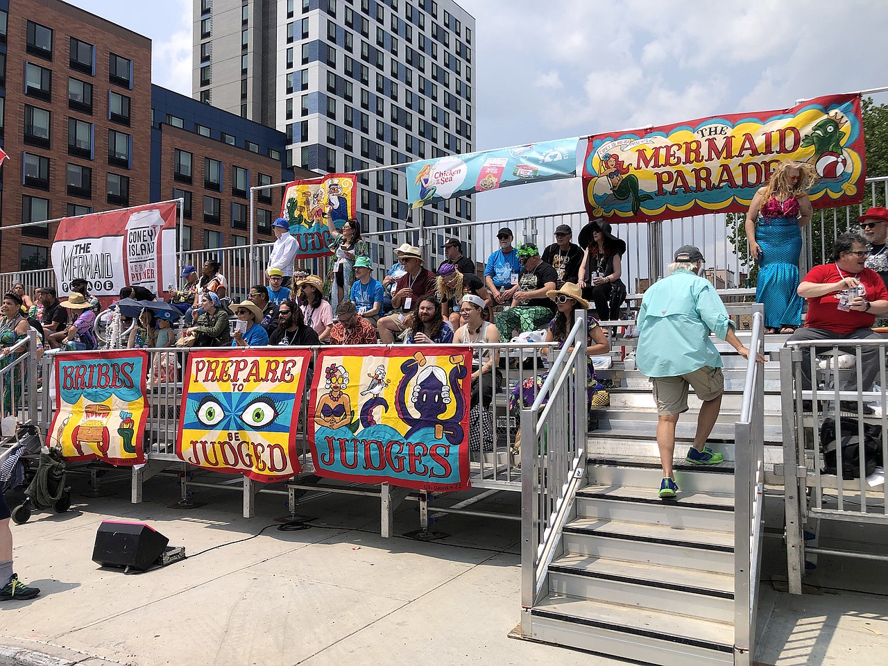 We headed to the V.I.P. section, which was right next to the Judges, and the best spot because everyone stops and performs there. There were also magical ‘Judge Bribes’ that were given as gifts from the participants such as pastries, salads, and sunglasses. We got seated on comfy red mini-chairs that attached to the bleachers, and had wonderful holographic goodie bags on each seat waiting for us. Inside the entitled “mermaid approved” bag were hats, beaded necklaces, colorful koozies, clam fans, and on-brand ocean-esque gummies, such as Swedish Fish and more! It was hard to sit still from all the excitement with all the delicious food, drinks, costumes and floats all around.