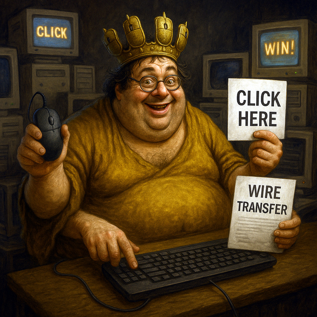 - Fraudulus the Ever-Clicking — eternally clicking suspicious links and demanding wire transfers to obscure accounts.