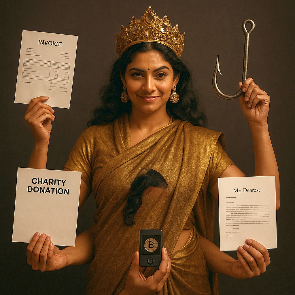 - Multiple arms, each holding a different tool of deception: a fake invoice, a fake charity flyer, a phishing hook, a romance scam letter, a crypto wallet.