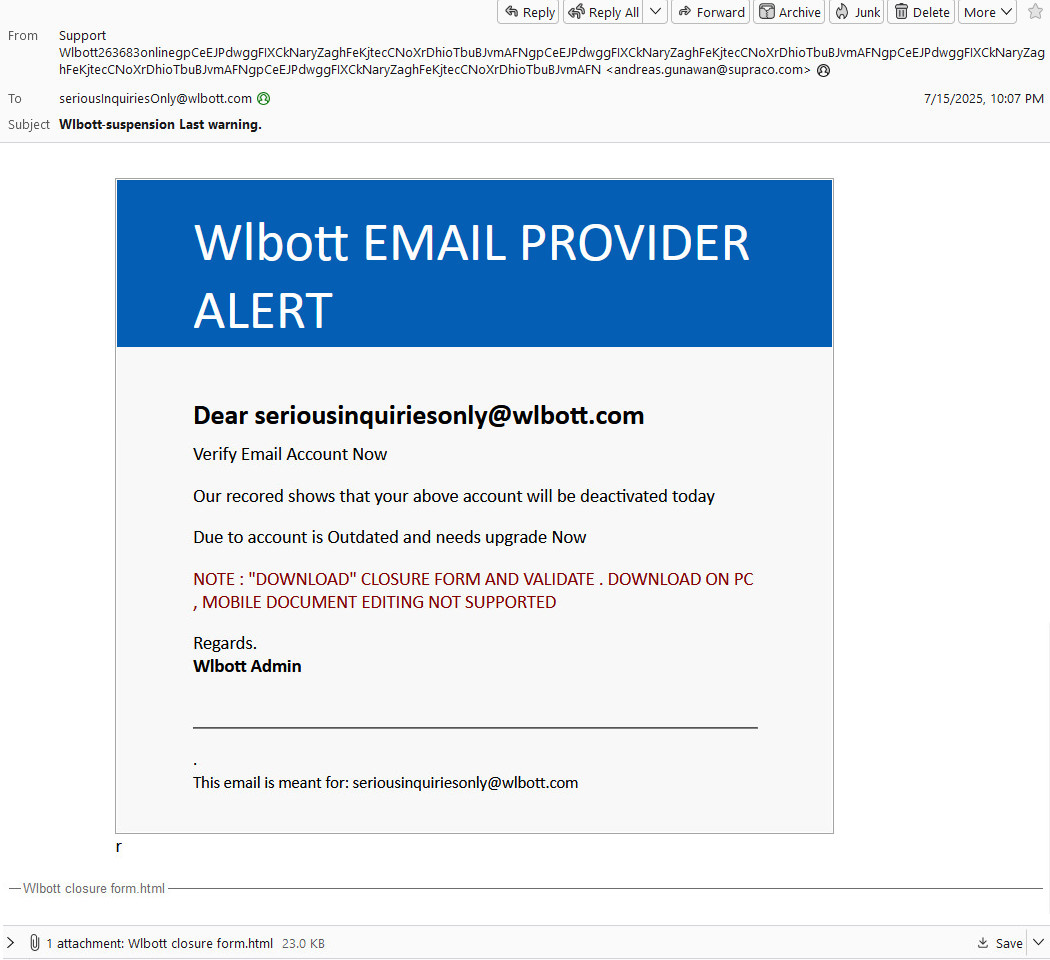 - These sorry dogs used our public facing email account “seriousInquiriesOnly@wlbott.com”. It was clearly not a serious inquiry.