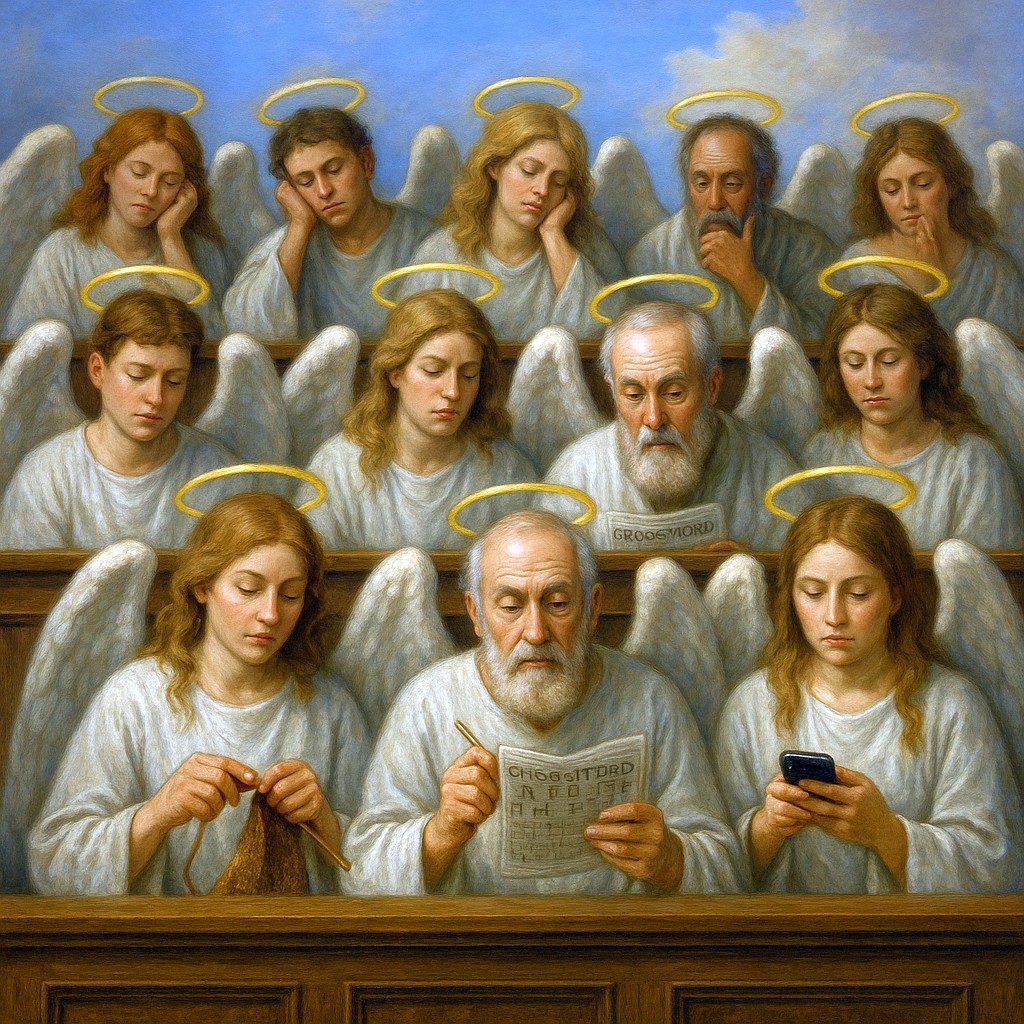 At first, you are pretty dismayed. The jury members are bored out of their halos – some knitting, some playing sudoku, but most just hallelujah-scrolling thru their phones.