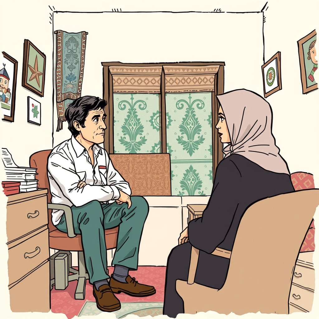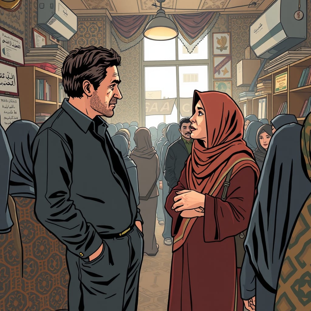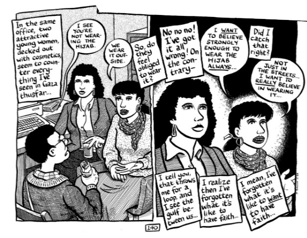 When Joe Sacco is visiting an office in Gaza Town, he has an interesting conversation about hijabs. (Panel from Joe Sacco’s Palestine, page 140).