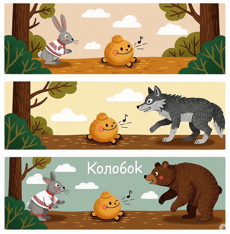 As it rolls away, it meets several animals – a rabbit, a wolf, and a bear. Each animal threatens to eat the kolobok!