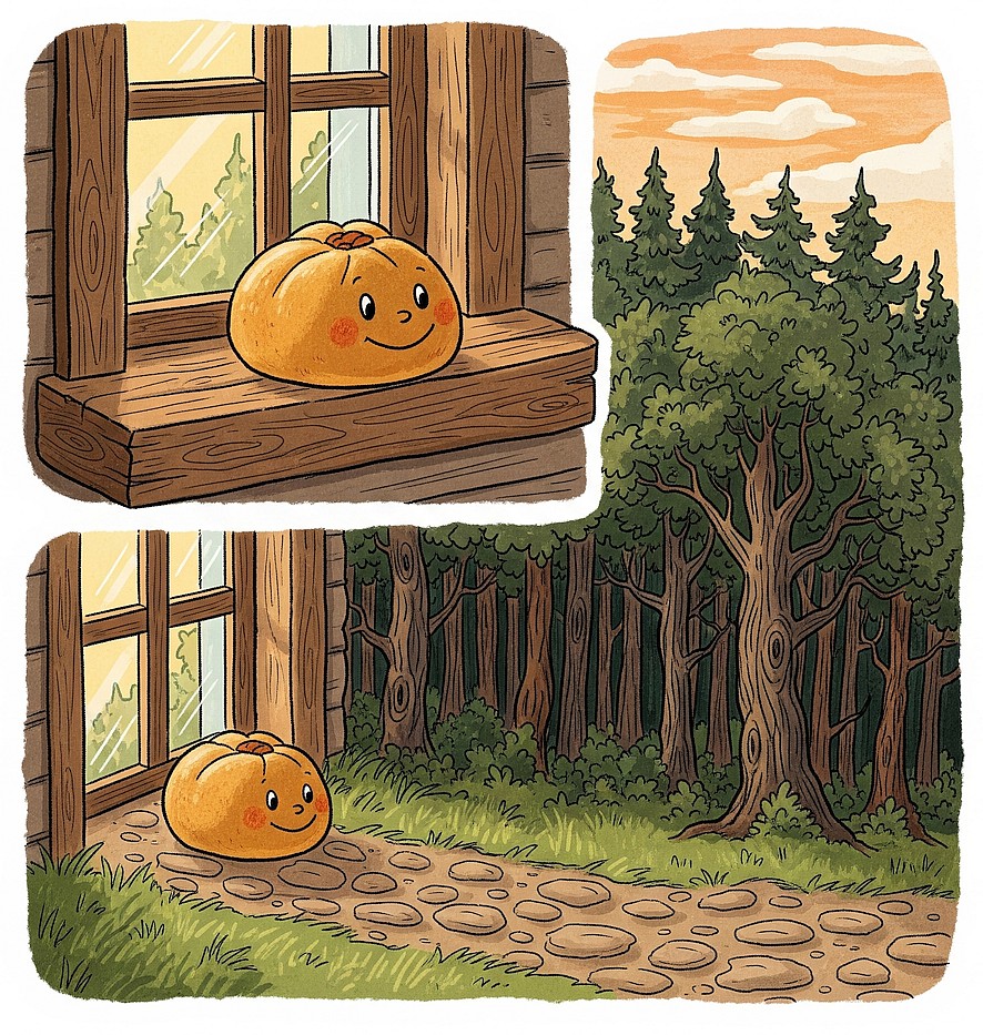 However, the kolobok comes alive, rolls off the windowsill and escapes into the forest!