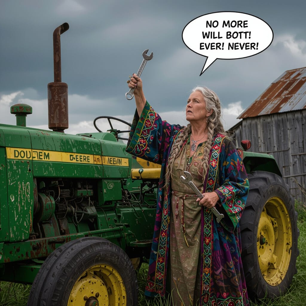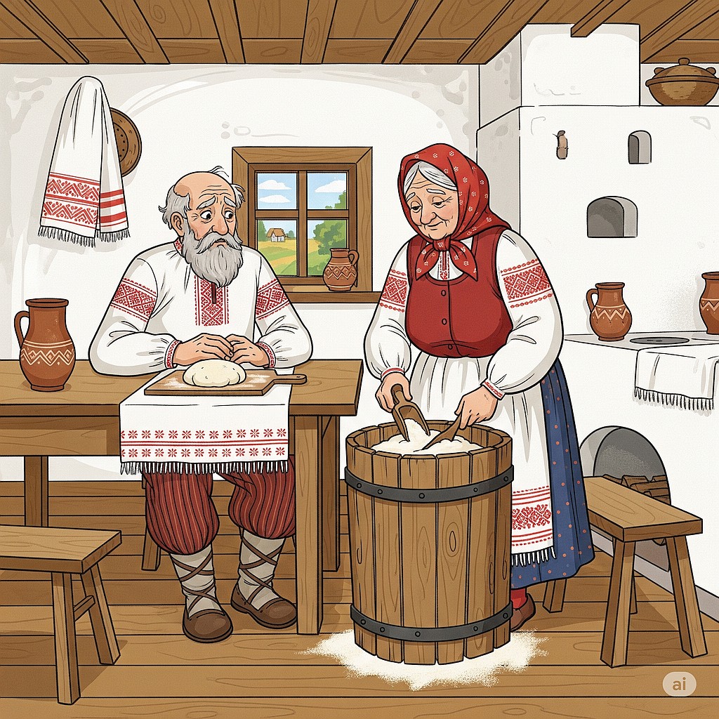 An old man and a old woman, who are very poor, realize they have no food. The old woman scrapes together the last bit of flour from the bottom of her flour bin to make a small, round loaf of bread.