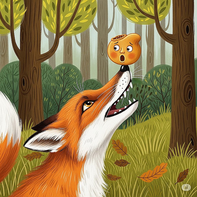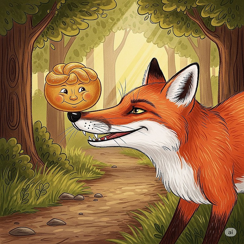 Finally, the kolobok meets a sly fox. The fox pretends to be hard of hearing and asks the kolobok to sit on its nose and sing the song again. The kolobok, full of pride and arrogance from its previous successes, agrees.