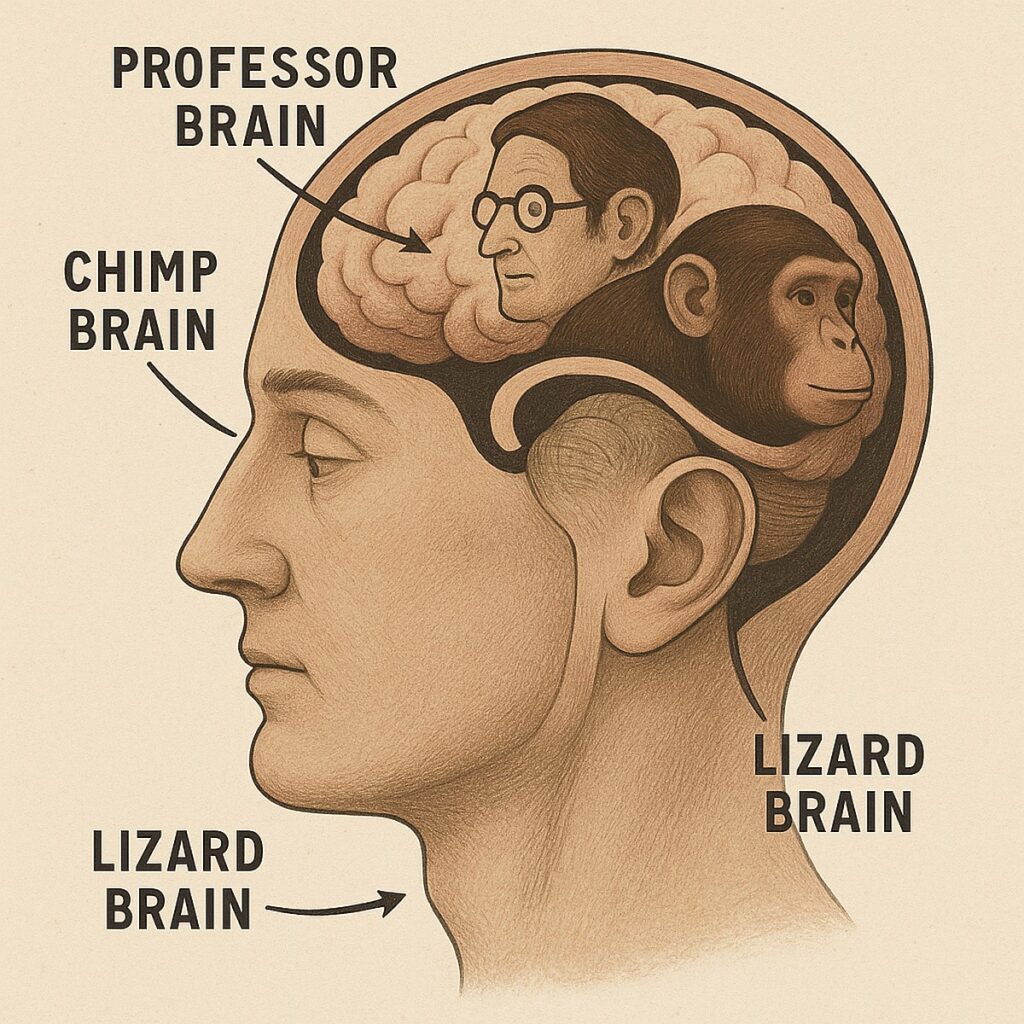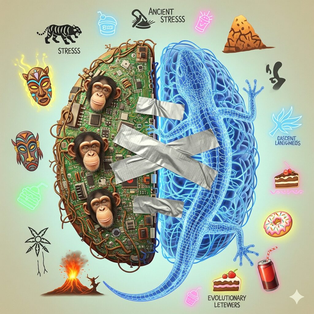 Instead of a smooth upgrade path, evolution duct-taped them together, so we get conflicting signals: panic, impulse, and reason all arguing at once.