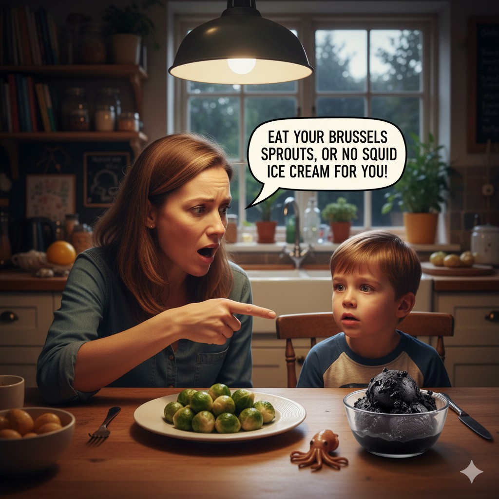 Elder G enumerates the yummiest! “Eat your Brussels Sprouts, or no squid ice cream for you!”