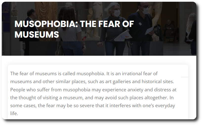 [ed. note: as part of our corporate employee assistance, we are analyzing UC#1’s fear of museums. At this point in our research, we encountered some conflicting information. One site claims that Musophobia as the fear of museums.]