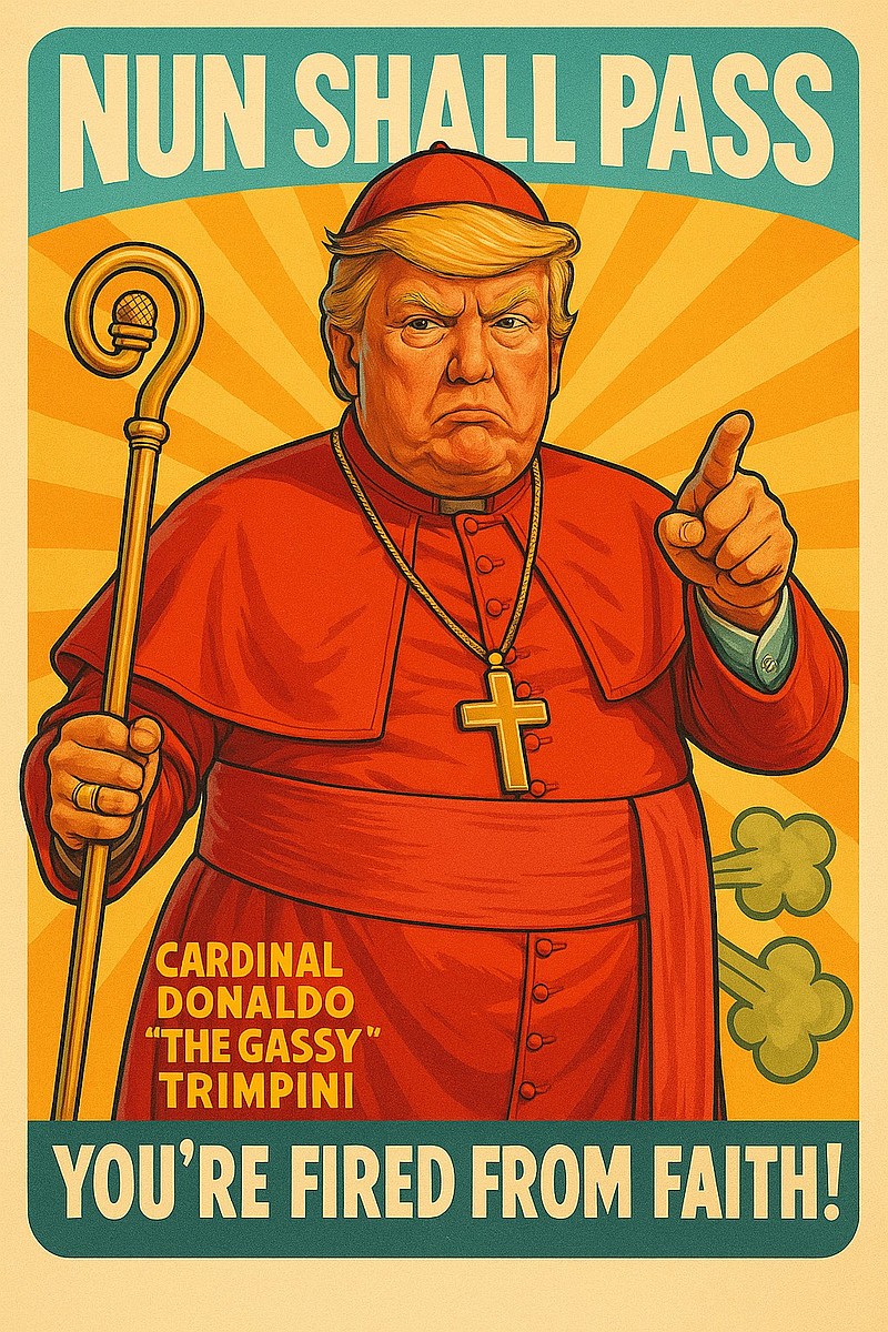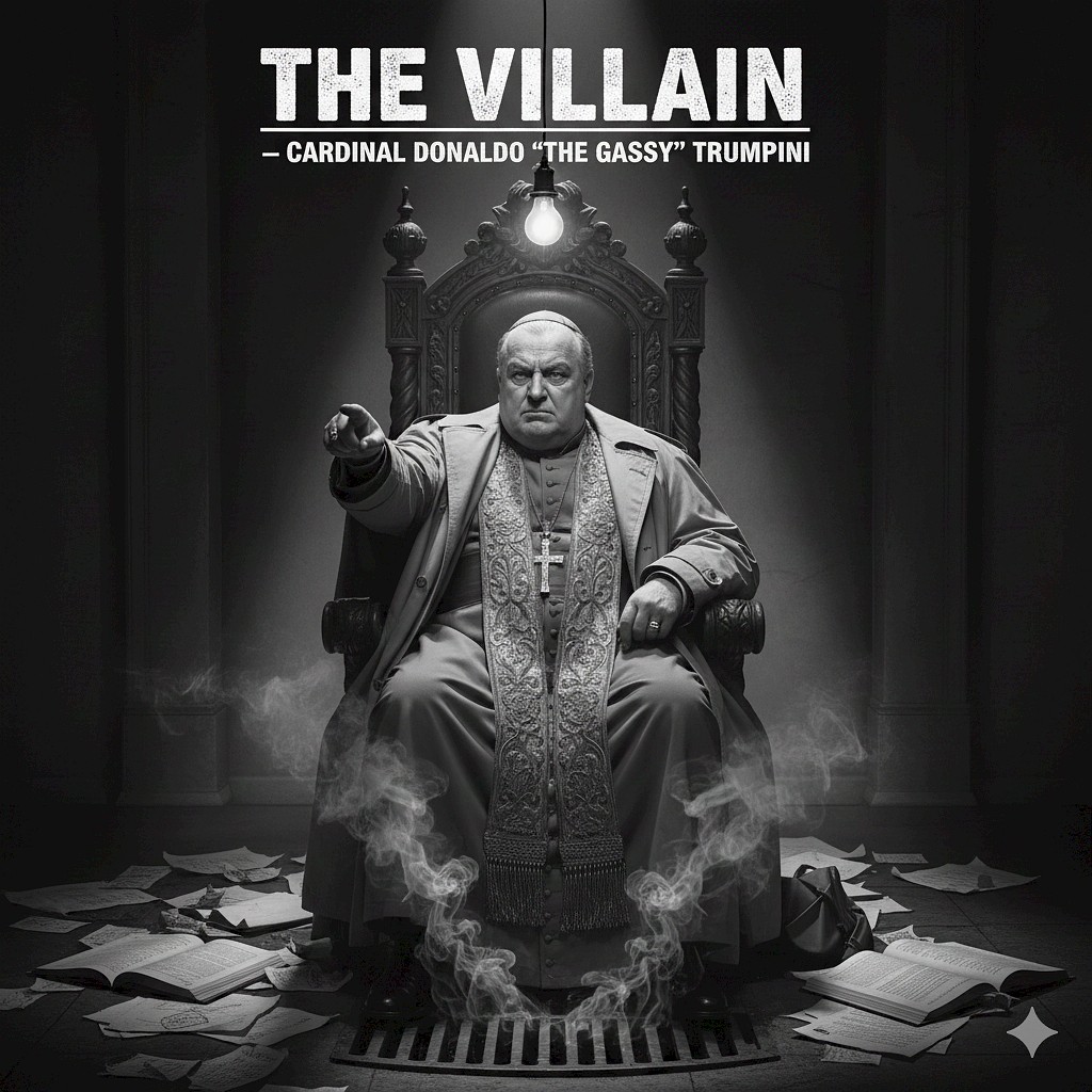 Cardinal Donaldo “The Gassy” Trumpini – an overstuffed church bureaucrat who believes flatulence is a sign of divine favor.