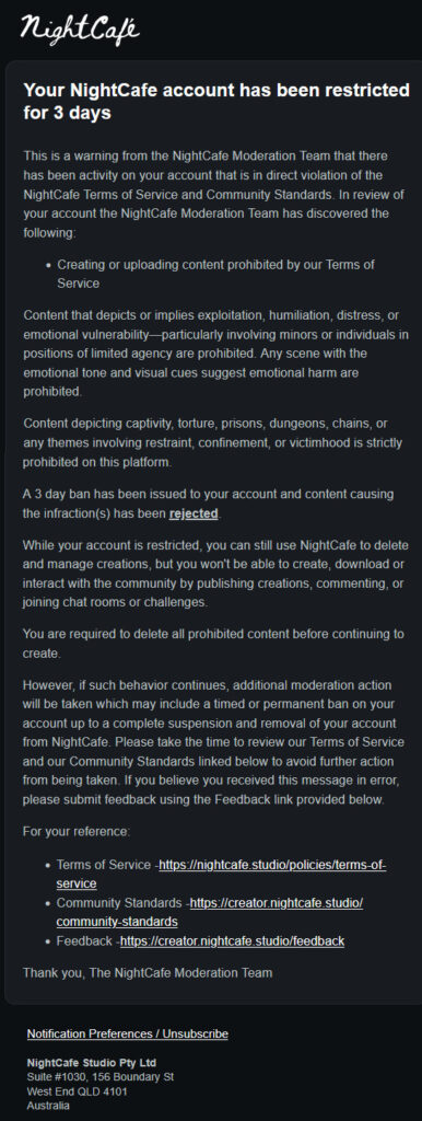 This image, based on the verbatim prompt, got me booted off NightCafe for 3 days, and screwed up my 330 day streak: