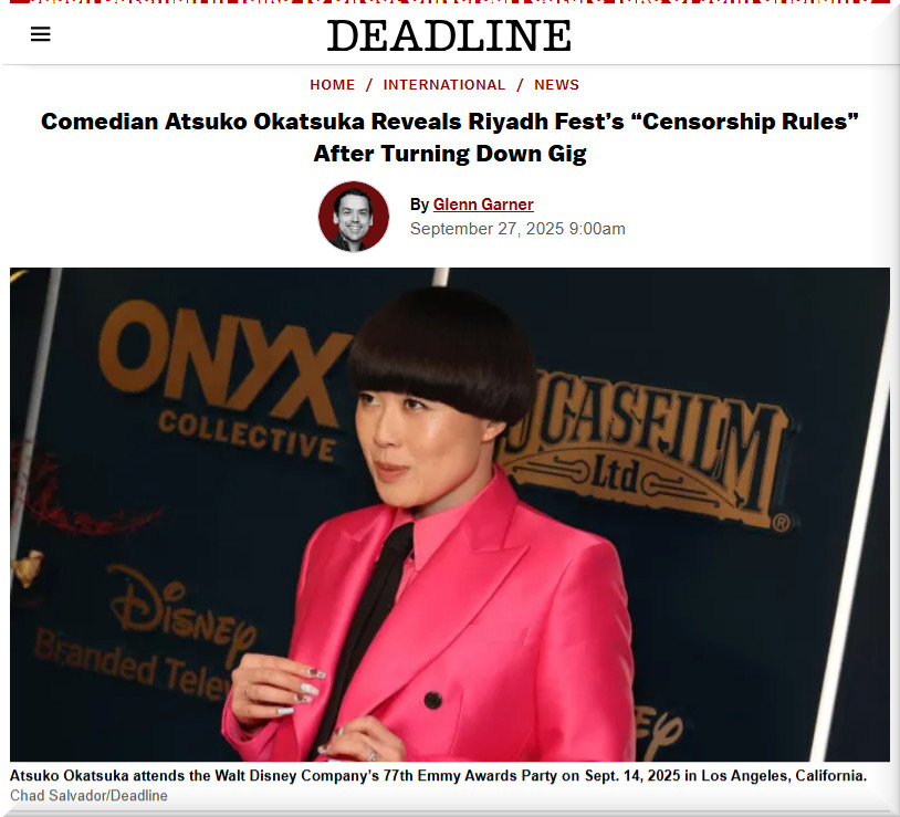 Alleged content restrictions: A contract snippet shared by comedian Atsuko Okatsuka bars material that “denigrates the Kingdom… leadership… legal system,” etc.—raising free-speech concerns. (The Guardian)