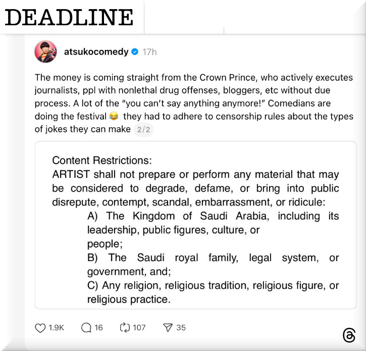 “The money is coming straight from the Crown Prince, who actively executes journalists, ppl with nonlethal drug offenses, bloggers, etc without due process. A lot of the ‘you can’t say anything anymore!’ comedians are doing the festival,” added Okatsuka with screenshots of the contract. “They had to adhere to censorship rules about the types of jokes they can make.”