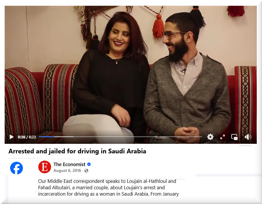 You can watch the video of Loujain driving into Saudi Arabia on this Facebook video. Note that this video was recorded two years before the Jamal Khashoggi murder, when people had hopes for reform thru the Crown Prince. But no.