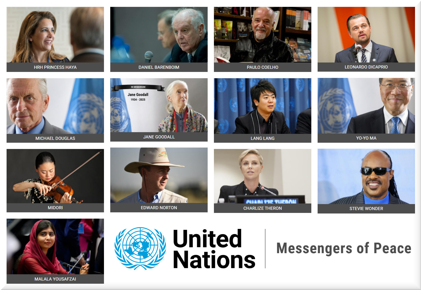 United Nations Messengers of Peace United Nations Messengers of Peace are high-profile individuals from the fields of art, literature, science, entertainment, sports or other fields of public life, who have committed themselves to helping the United Nations focus worldwide attention on pressing global issues that are close to their hearts.