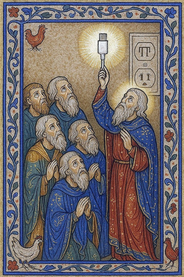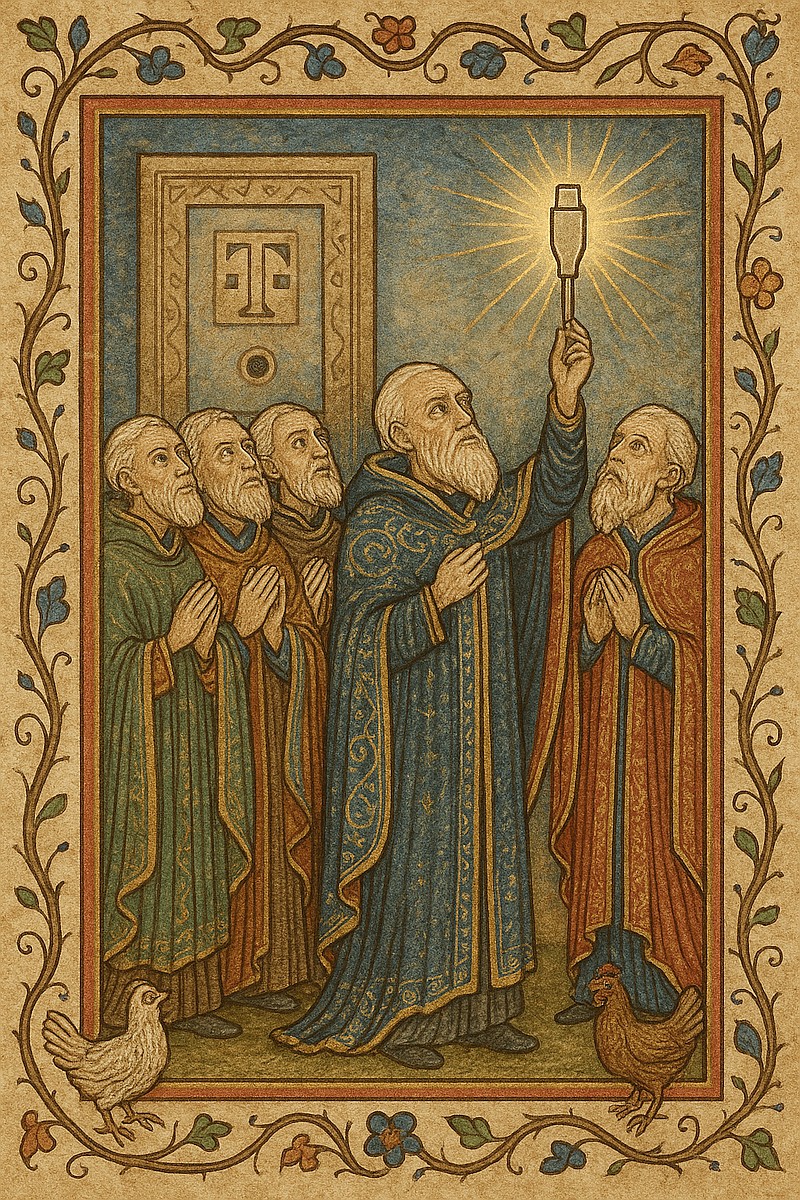 A High Elder steps forward holding the sacred cable, known among the Elders only as The Reversible Connector—a new technology rumored to work no matter which way you insert it (in theory).
