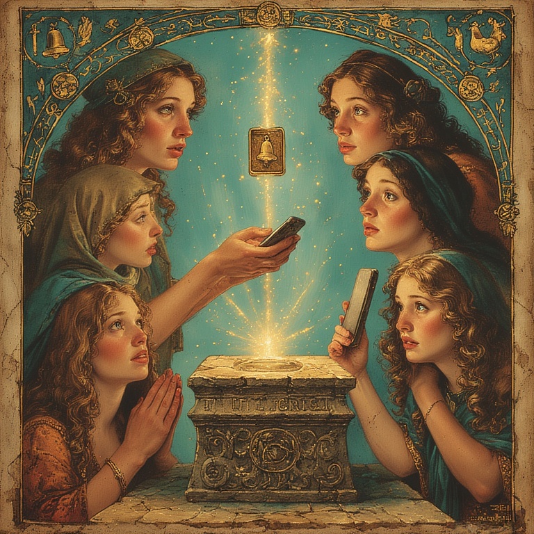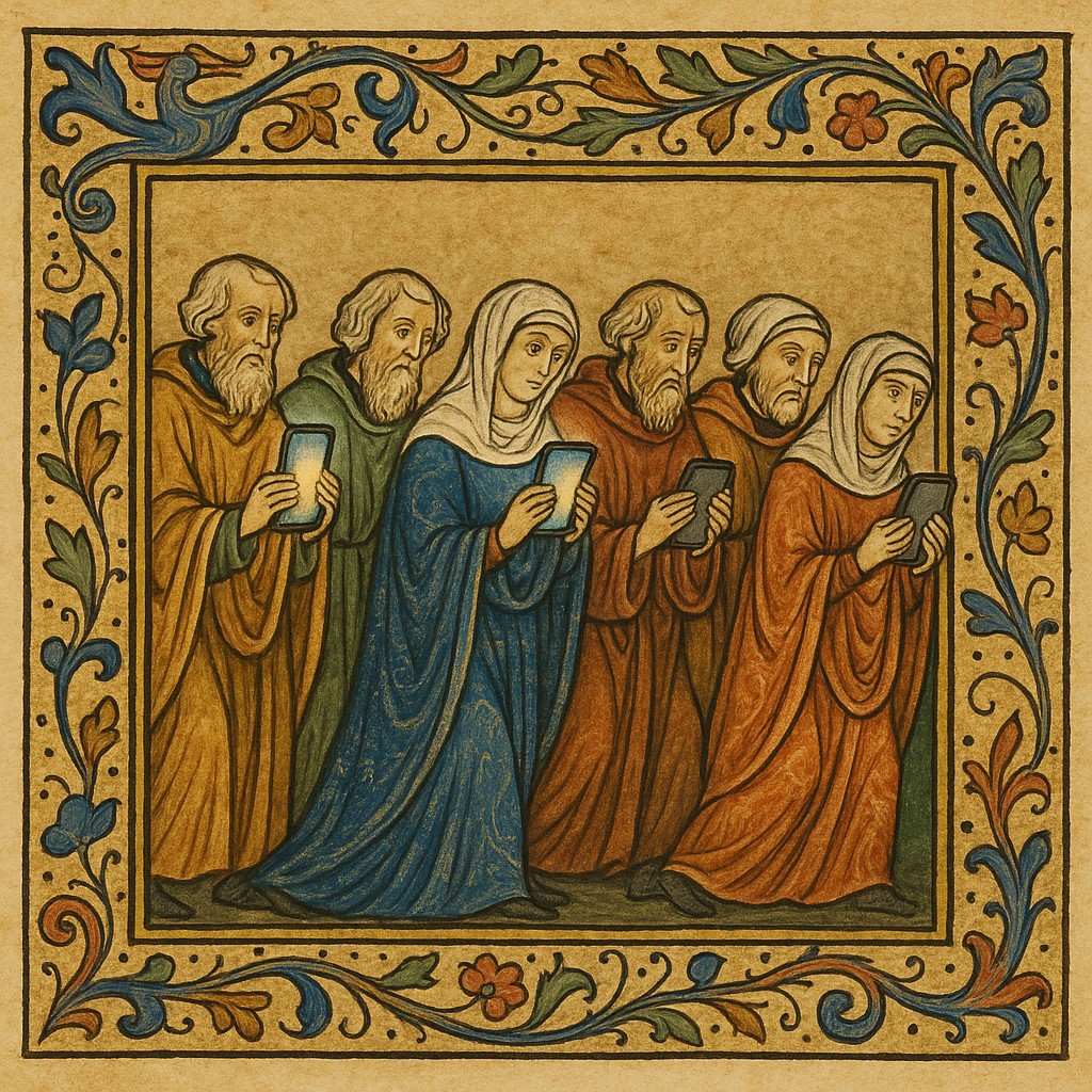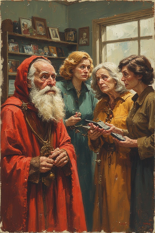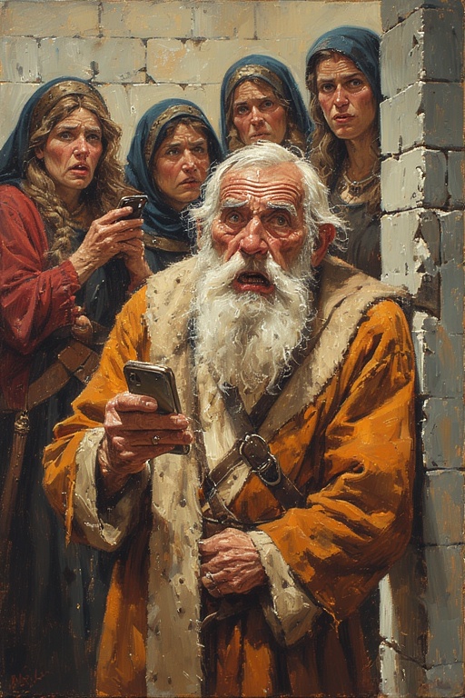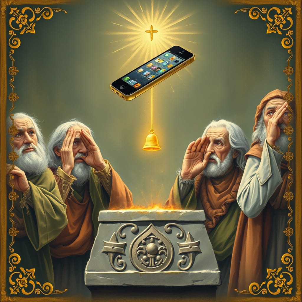 The Elders return in a slow solemn march, each carrying their new device in its slick cardboard shrine. The boxes are held aloft like ancient relics, still bearing factory seals and the faint odor of corporate hope.