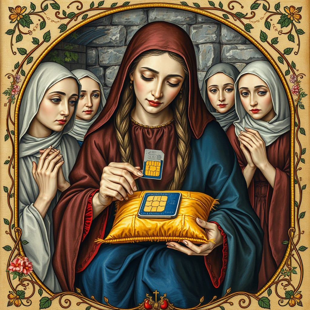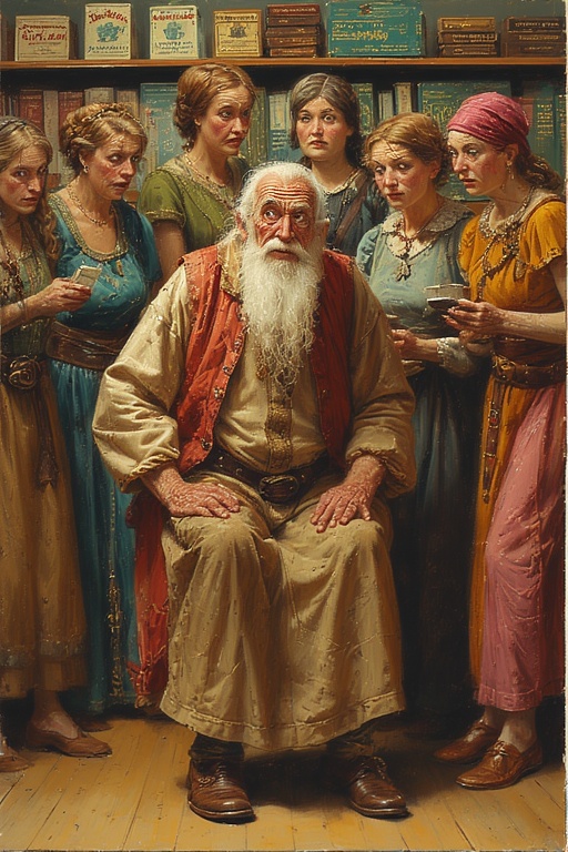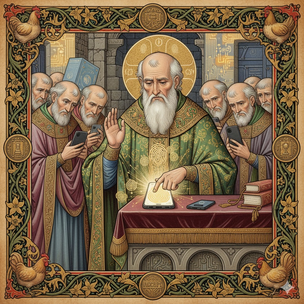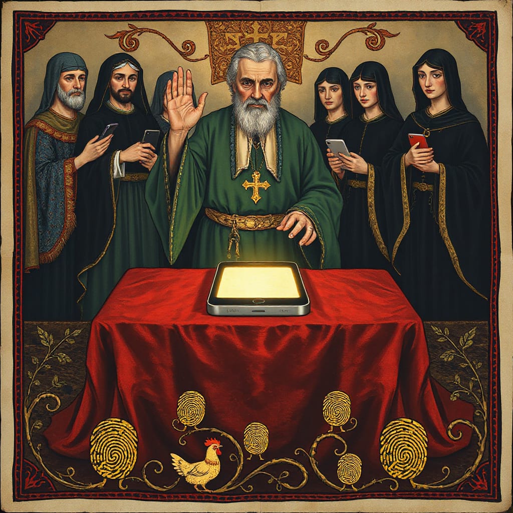The Elders return in a slow solemn march, each carrying their new device in its slick cardboard shrine. The boxes are held aloft like ancient relics, still bearing factory seals and the faint odor of corporate hope.