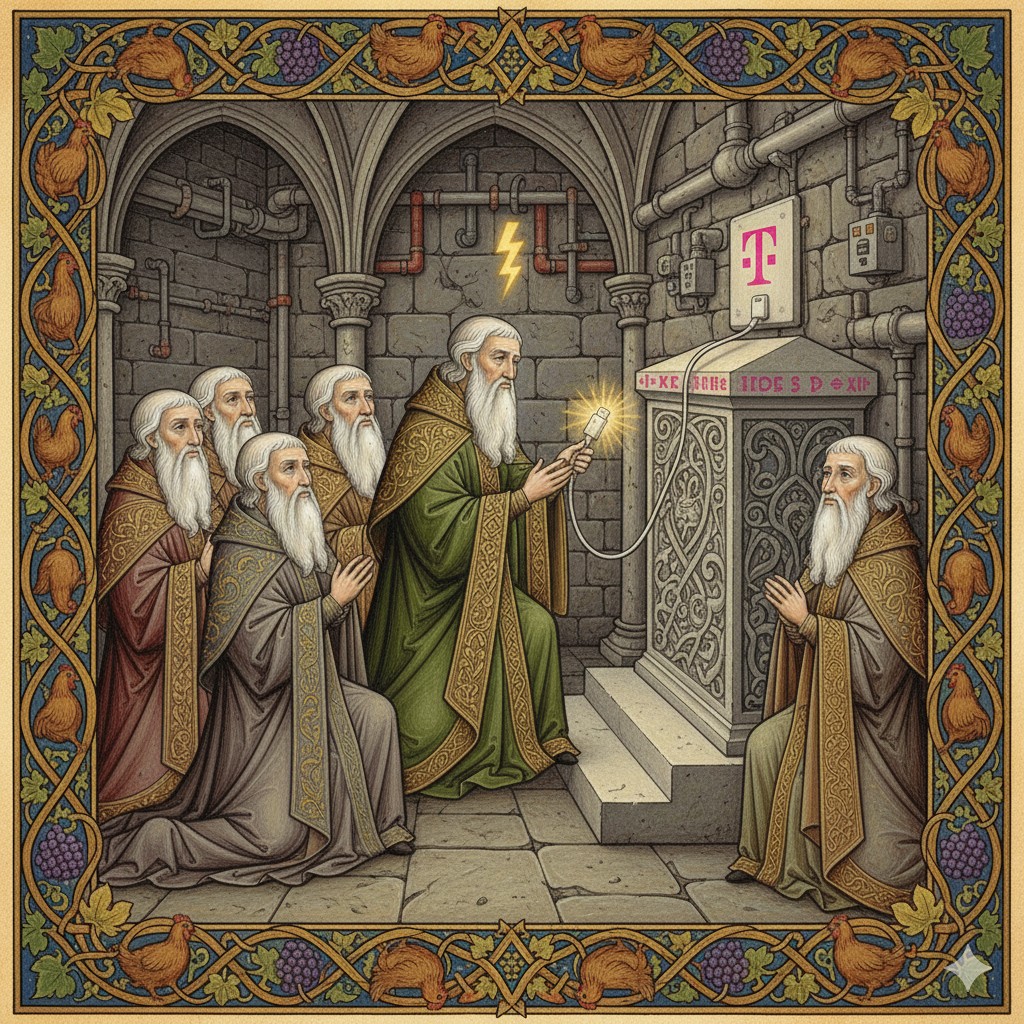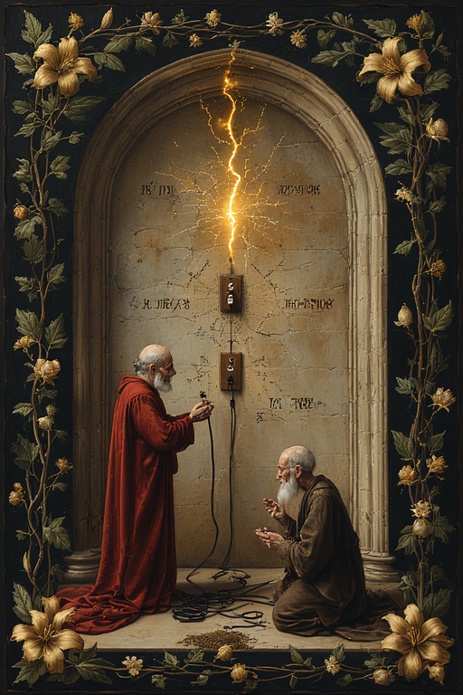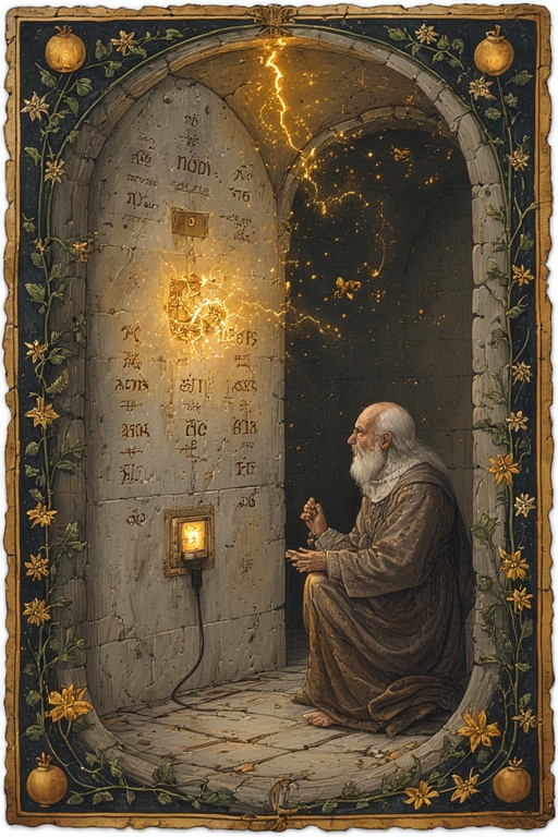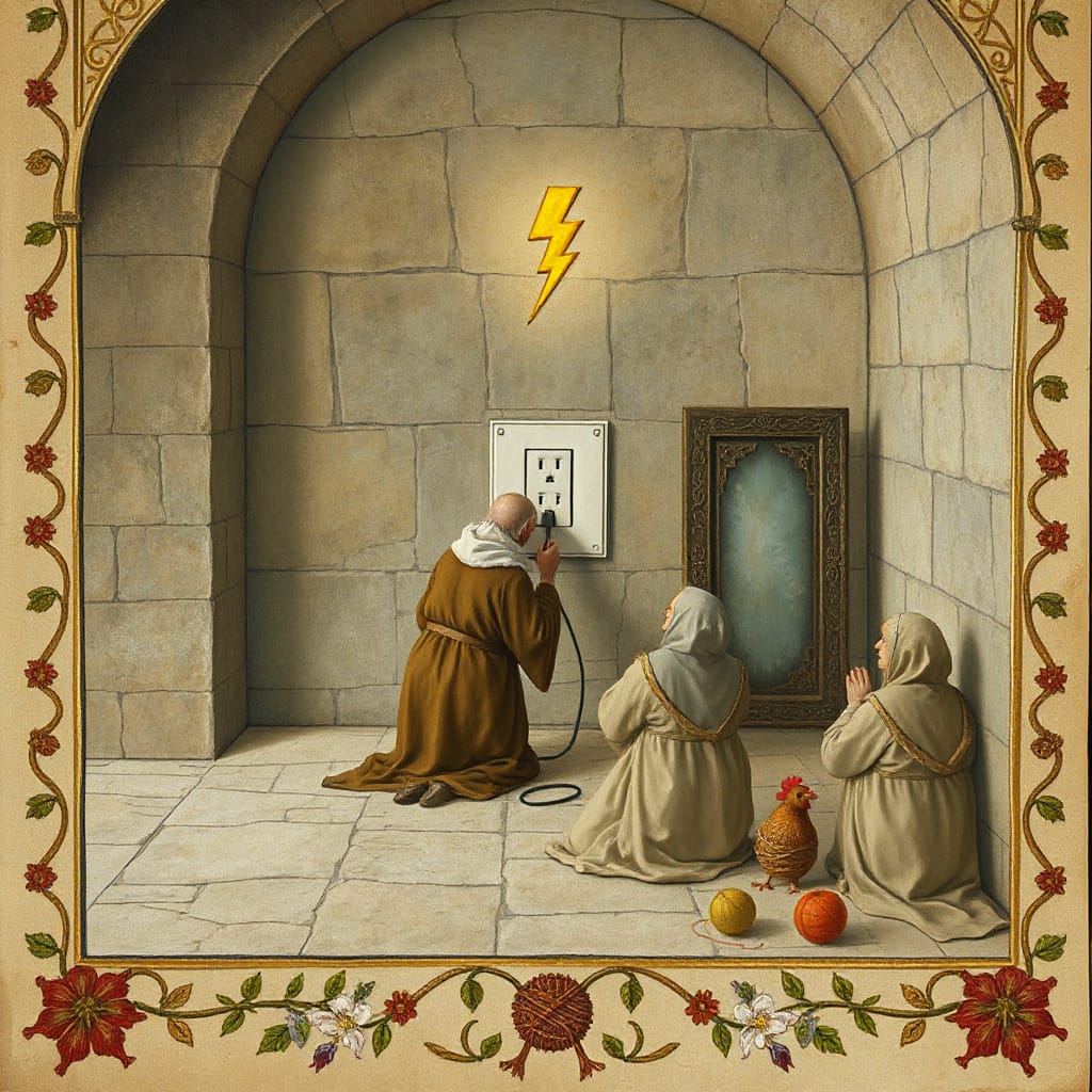 The cable is presented before the Wall of Outlets, a fearsome installation of sockets rumored to hold the very essence of lightning. Elder JimZim approaches cautiously with the offering.