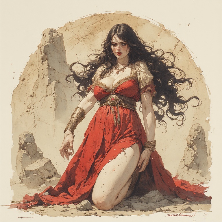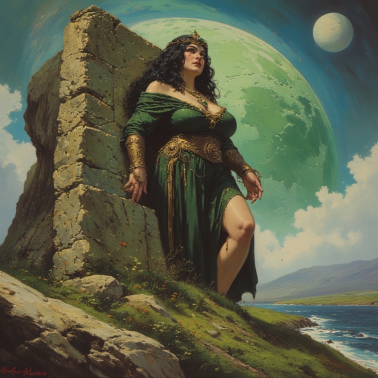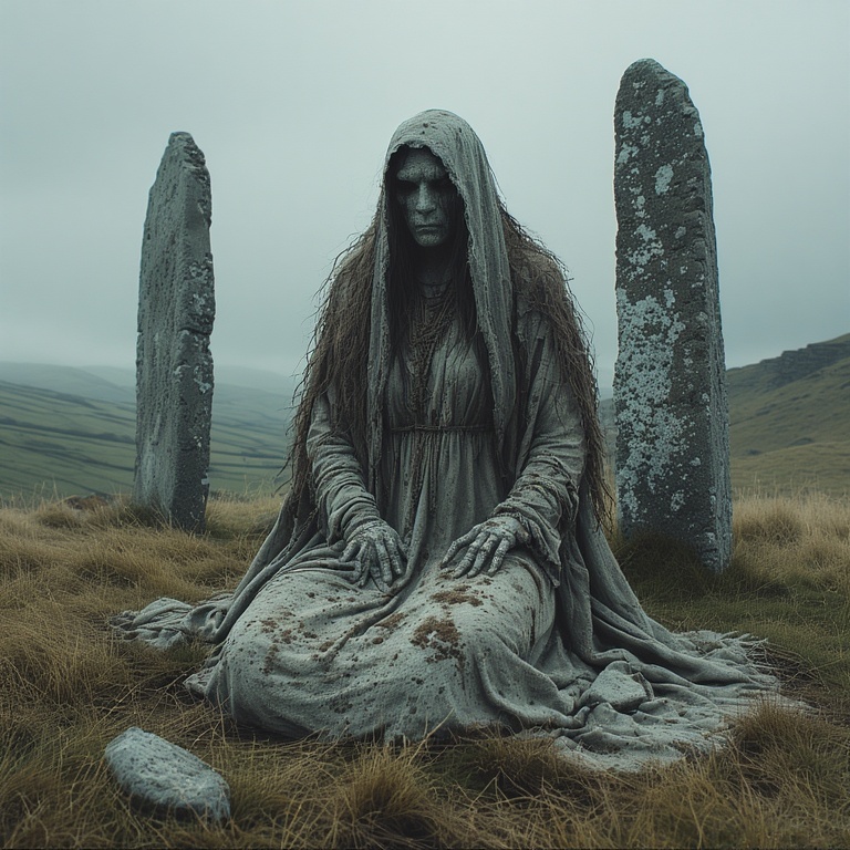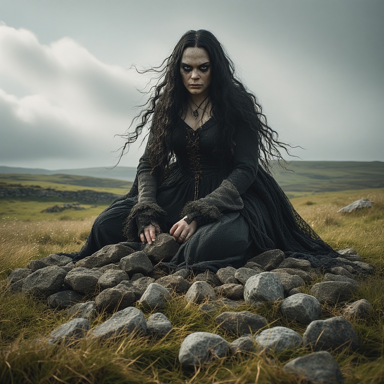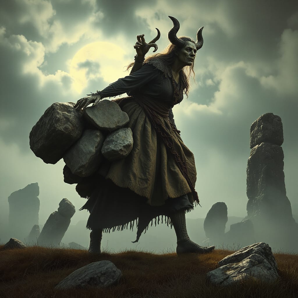 In Scotland, where she is also known as Beira, Queen of Winter (a name given by 20th-century folklorist Donald Alexander Mackenzie), she is credited with making numerous mountains and large hills, which are said to have been formed when she was striding across the land and accidentally dropped rocks from her creel or wicker basket. In other cases she is said to have built the mountains intentionally, to serve as her stepping stones. She carries a hammer for shaping the hills and valleys, and is said to be the mother of all the goddesses and gods. According to Mackenzie, Beira was a one-eyed giantess with white hair, dark blue skin, and rust-colored teeth.