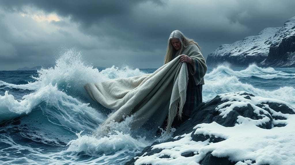 On the west coast of Scotland, the Cailleach ushers in winter by washing her great plaid in the Gulf of Corryvreckan (Gaelic: Coire Bhreacain – ‘whirlpool/cauldron of the plaid’). This process is said to take three days, during which the roar of the coming tempest is heard as far away as twenty miles (32 km) inland. When she is finished, her plaid is pure white and snow covers the land.