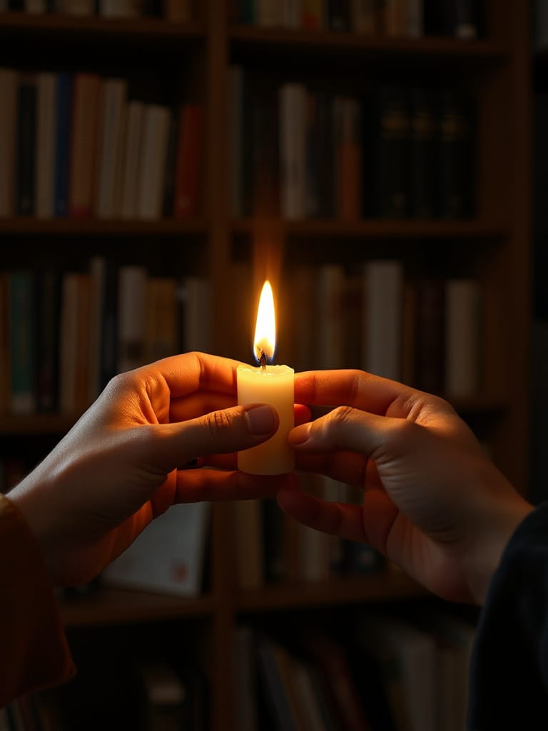One person – a teacher, a mentor, a parent – is gently lighting another’s candle from their own – a small, intimate gesture of gratitude, appreciation, and connection.